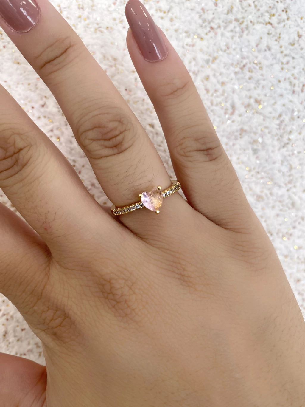 Anel Solitário Coração Rosa com Microzircônias - Banhado a Ouro