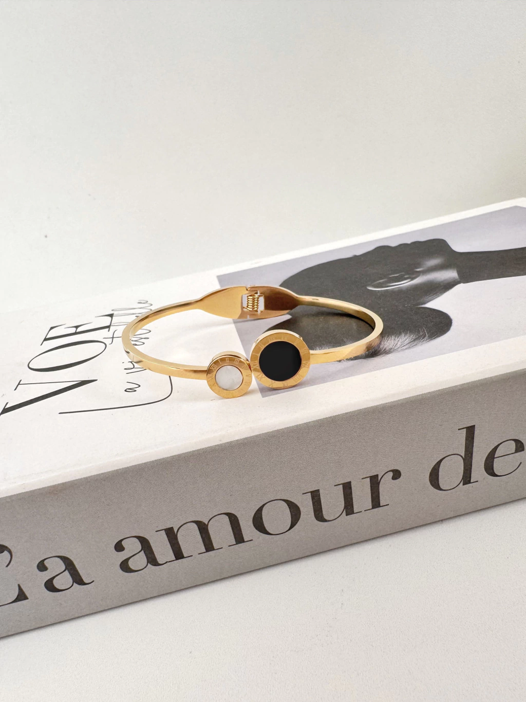 Com um design elegante e minimalista, esse bracelete combina o contraste sofisticado do preto e branco com o brilho do banho dourado. O detalhe do círculo esmaltado em duas cores traz um toque moderno e atemporal, perfeito para quem gosta de acessórios marcantes e fáceis de combinar. Uma peça versátil para acompanhar do look casual ao mais refinado.