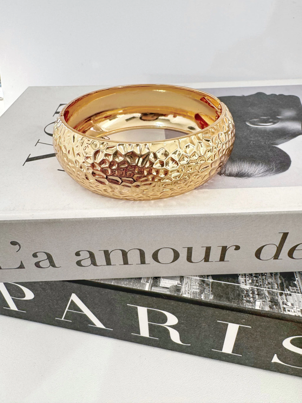 O Bracelete Facetado Detalhado Banhado a Ouro é a escolha ideal para quem busca elegância e sofisticação em uma peça única. Seu design facetado traz brilho e movimento ao acessório, garantindo um visual moderno e cheio de presença no pulso. Perfeito para usar sozinho ou em conjunto com outros braceletes para criar composições marcantes.