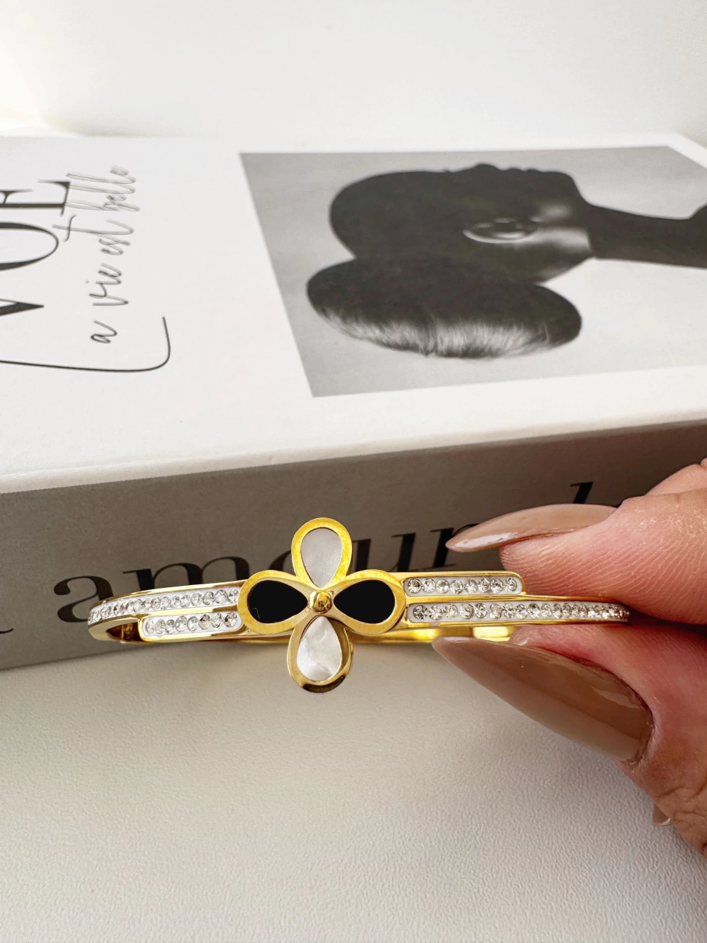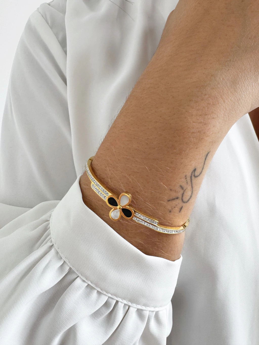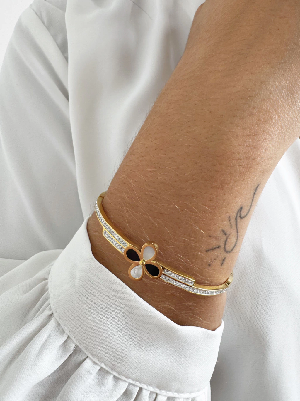 Bracelete Trevo Branco e Preto com Microzircônias em Aço Banhado a Ouro