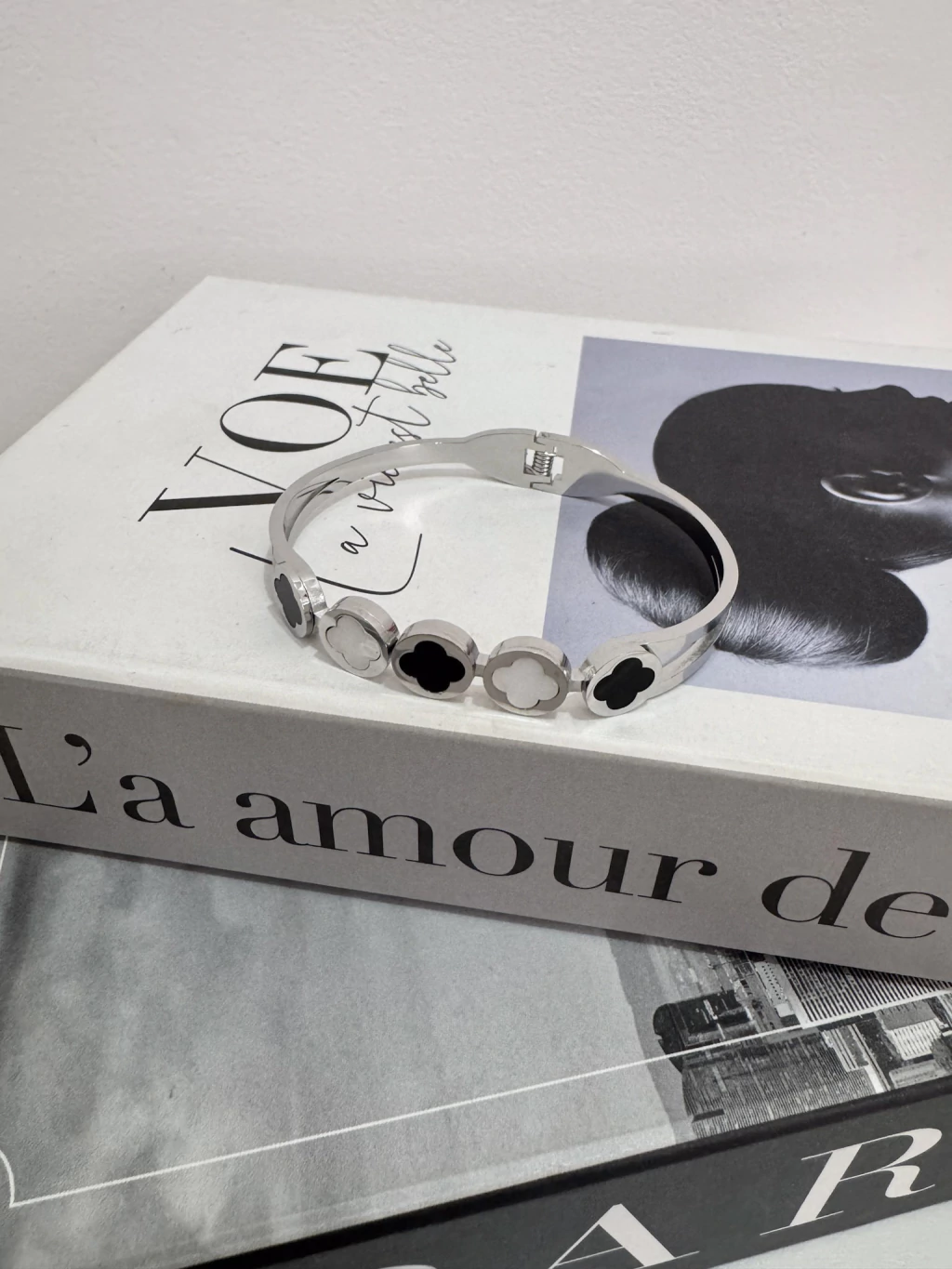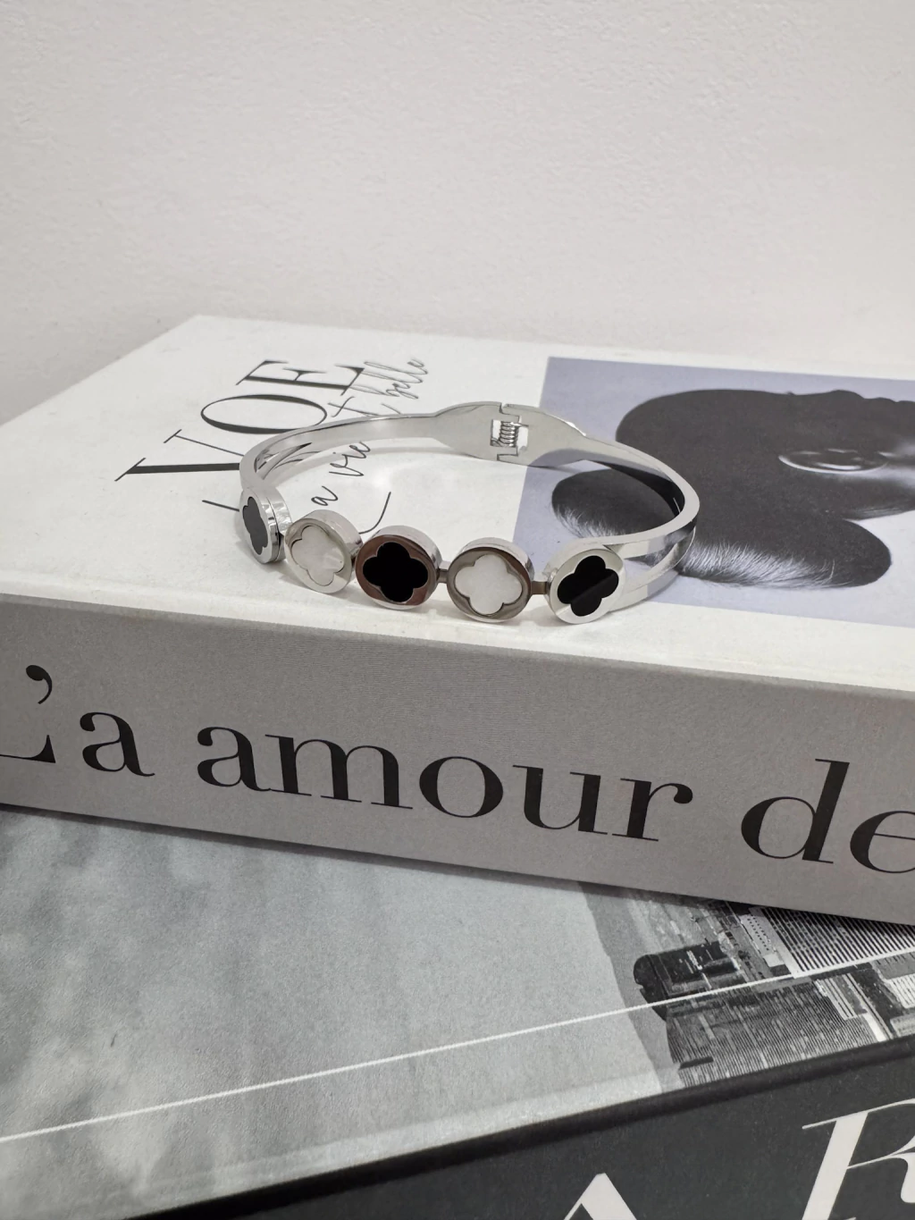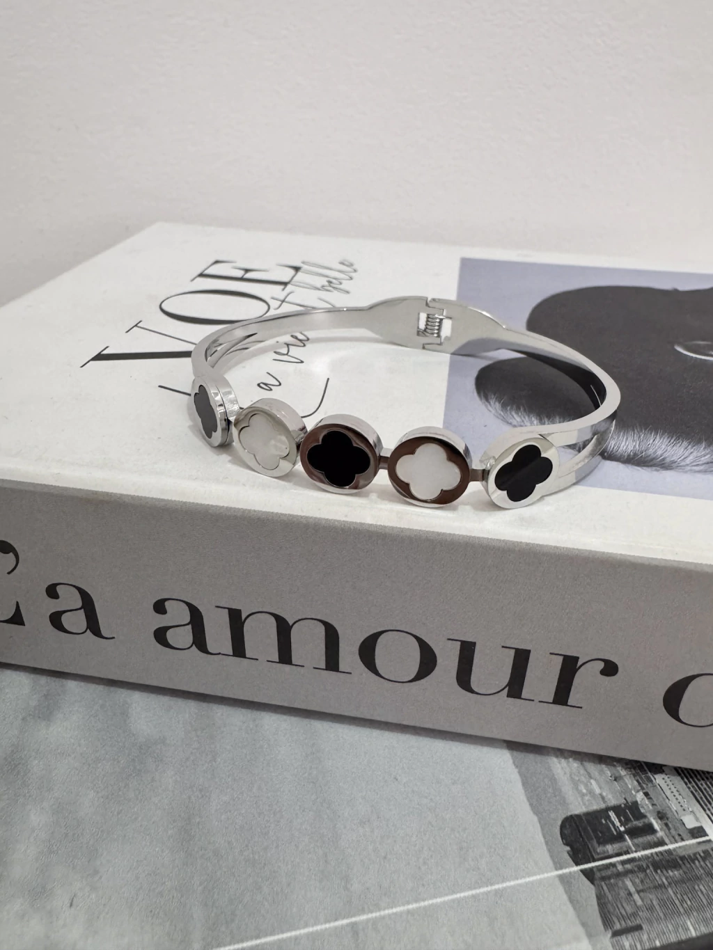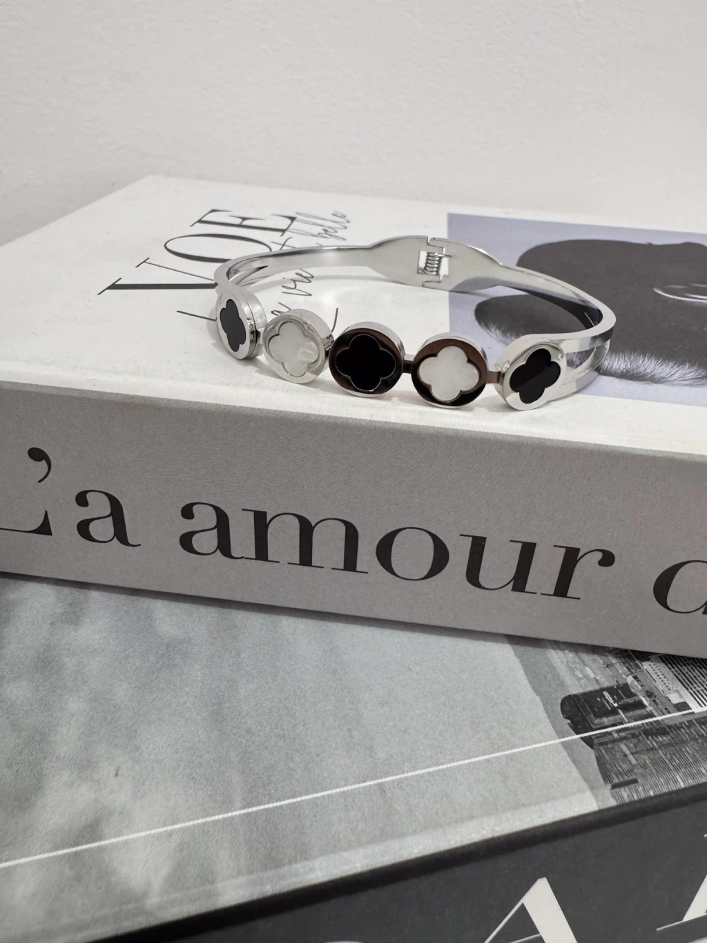 Elegância e simbolismo se encontram no Bracelete Trevos Preto e Branco - Aço, uma peça que combina sofisticação com um toque de sorte e harmonia. Feito em aço banhado, este bracelete apresenta dois trevos e um detalhe em zircônias, que adicionam um charme especial e significado à peça. Ideal para complementar produções casuais ou formais, é um acessório que reflete estilo e personalidade.