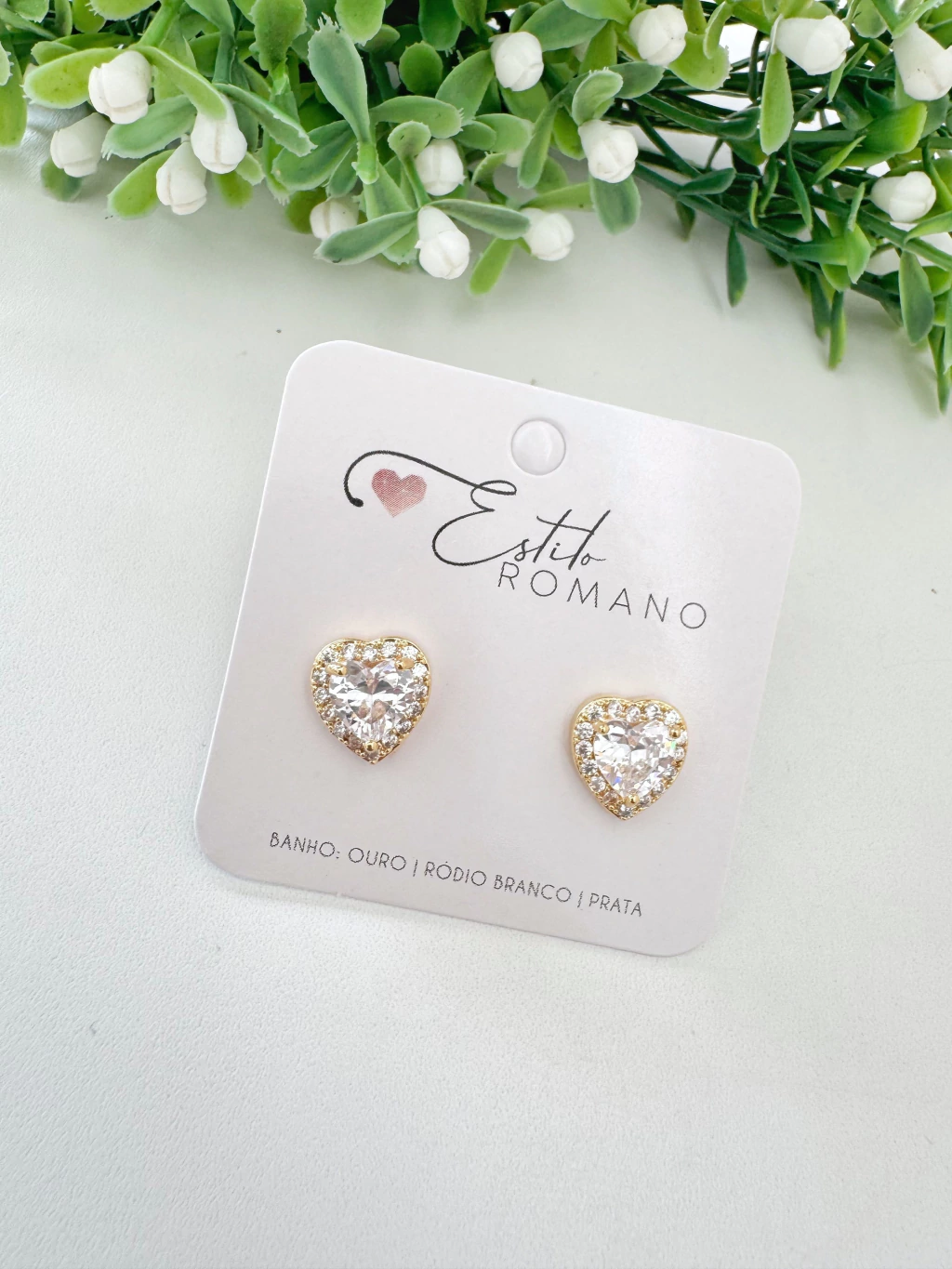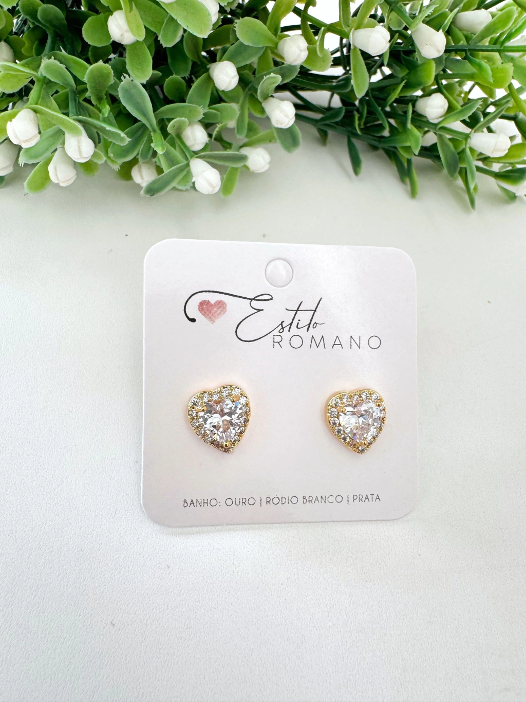 Brinco Coração Zircônia Cristal com Microzircônias Banhado a Ouro