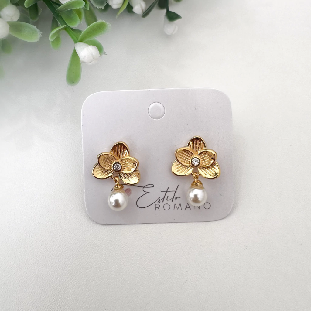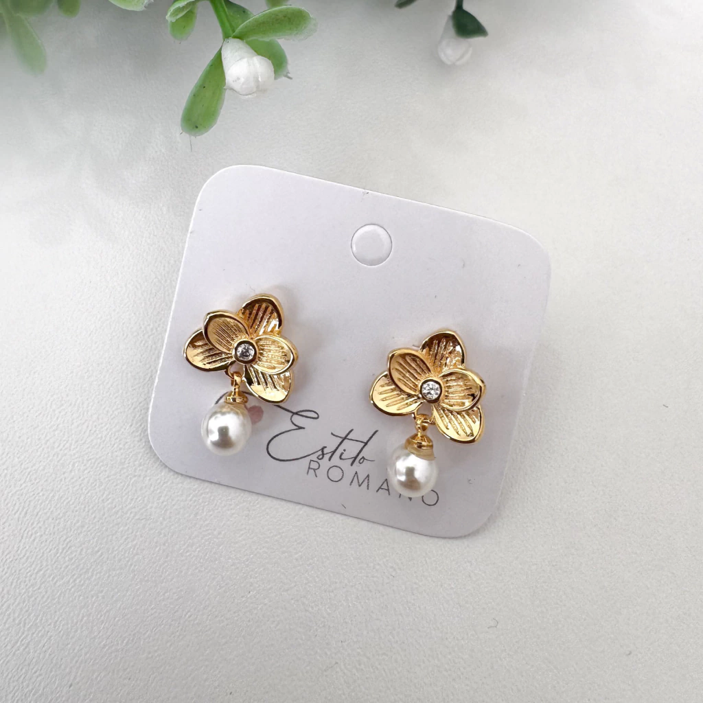 Brinco Flor com Pérola Pendente - Banhado a Ouro