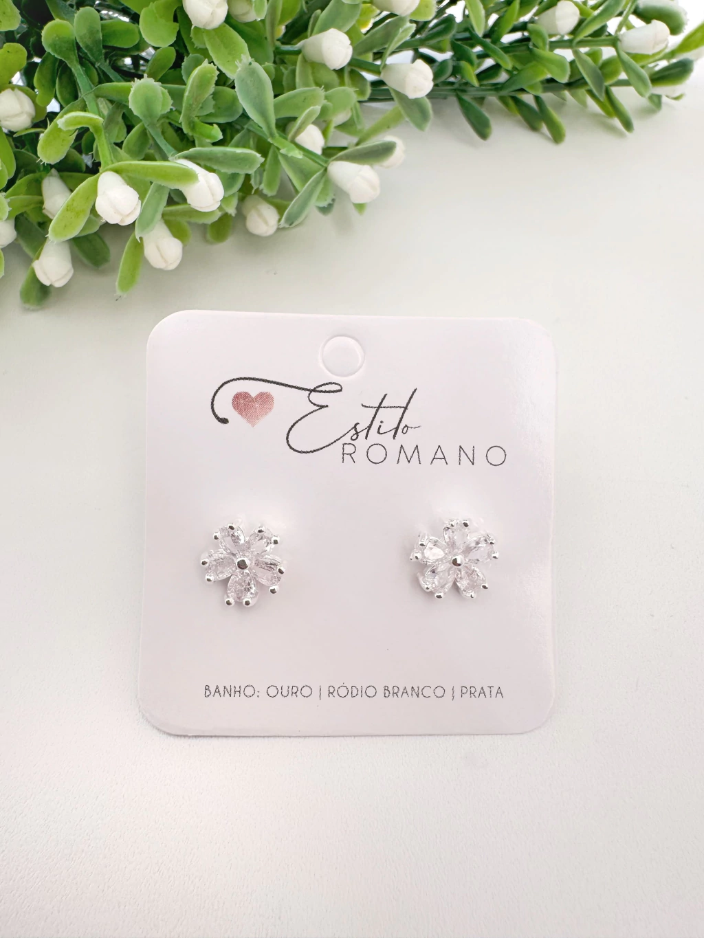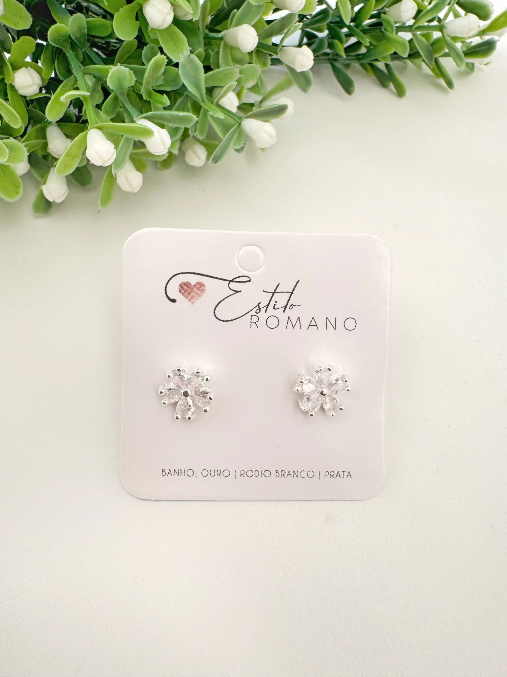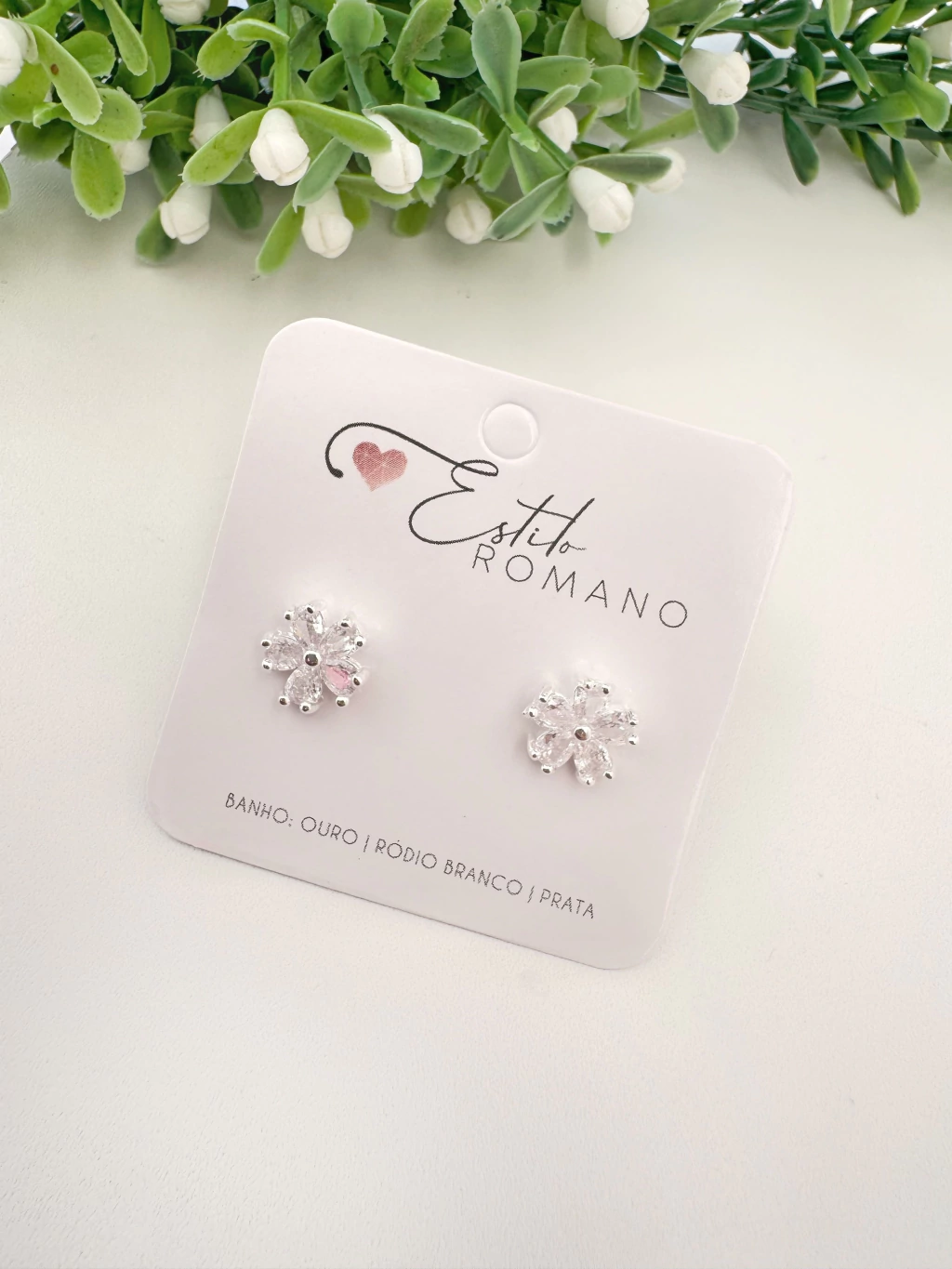 Brinco Flor Cravejada Zircônias Cristais 9mm - Banhado a Prata