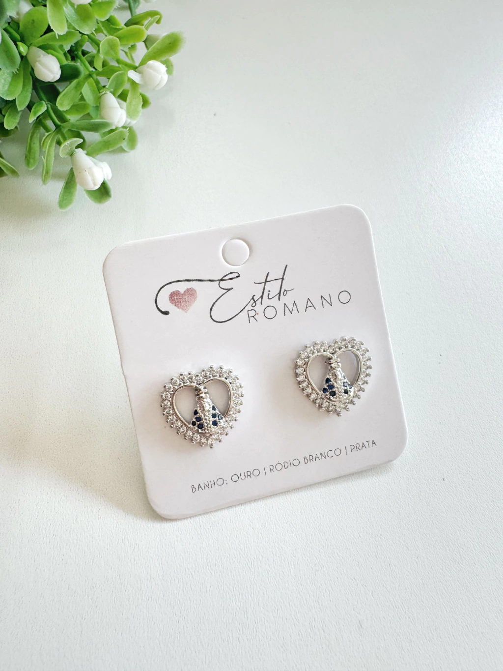 Brinco Nossa Senhora Coração Cravejado - Banhado a Ródio Branco
