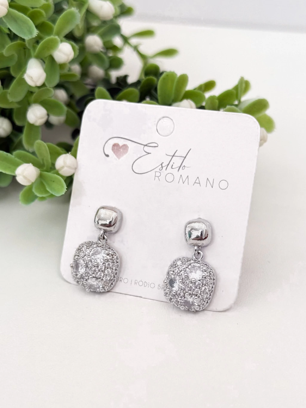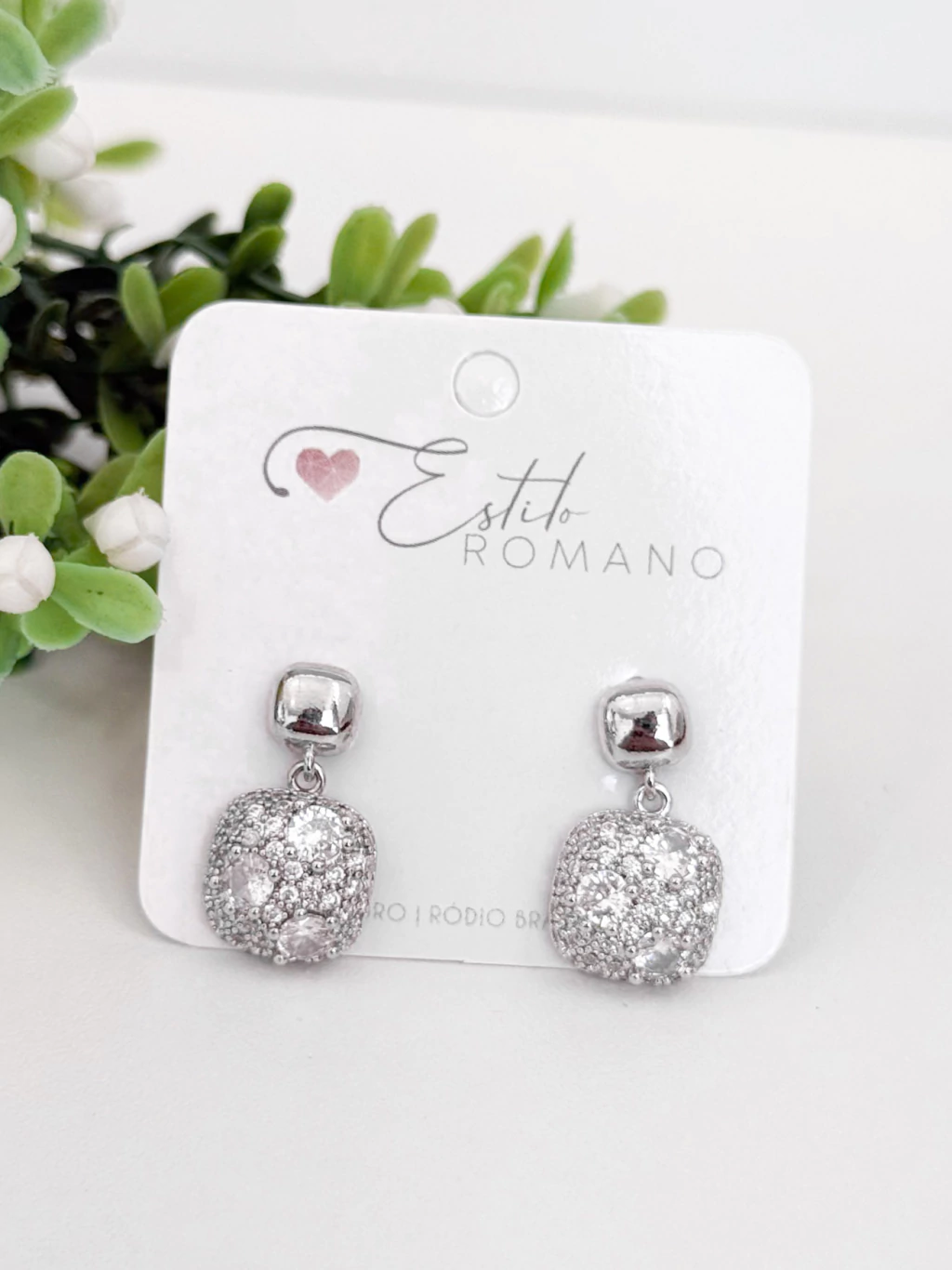 Brinco Quadrado Pendente Cravejado - Banhado a Ródio Branco