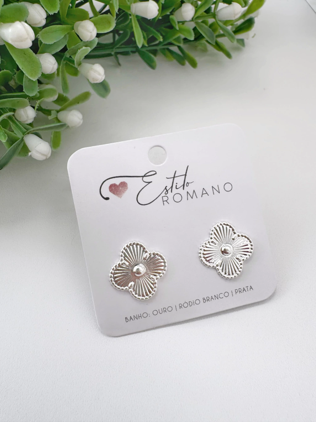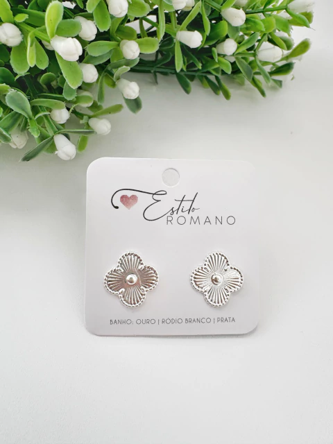 Brinco Trevo Detalhado Grande Banhado a Ródio Branco