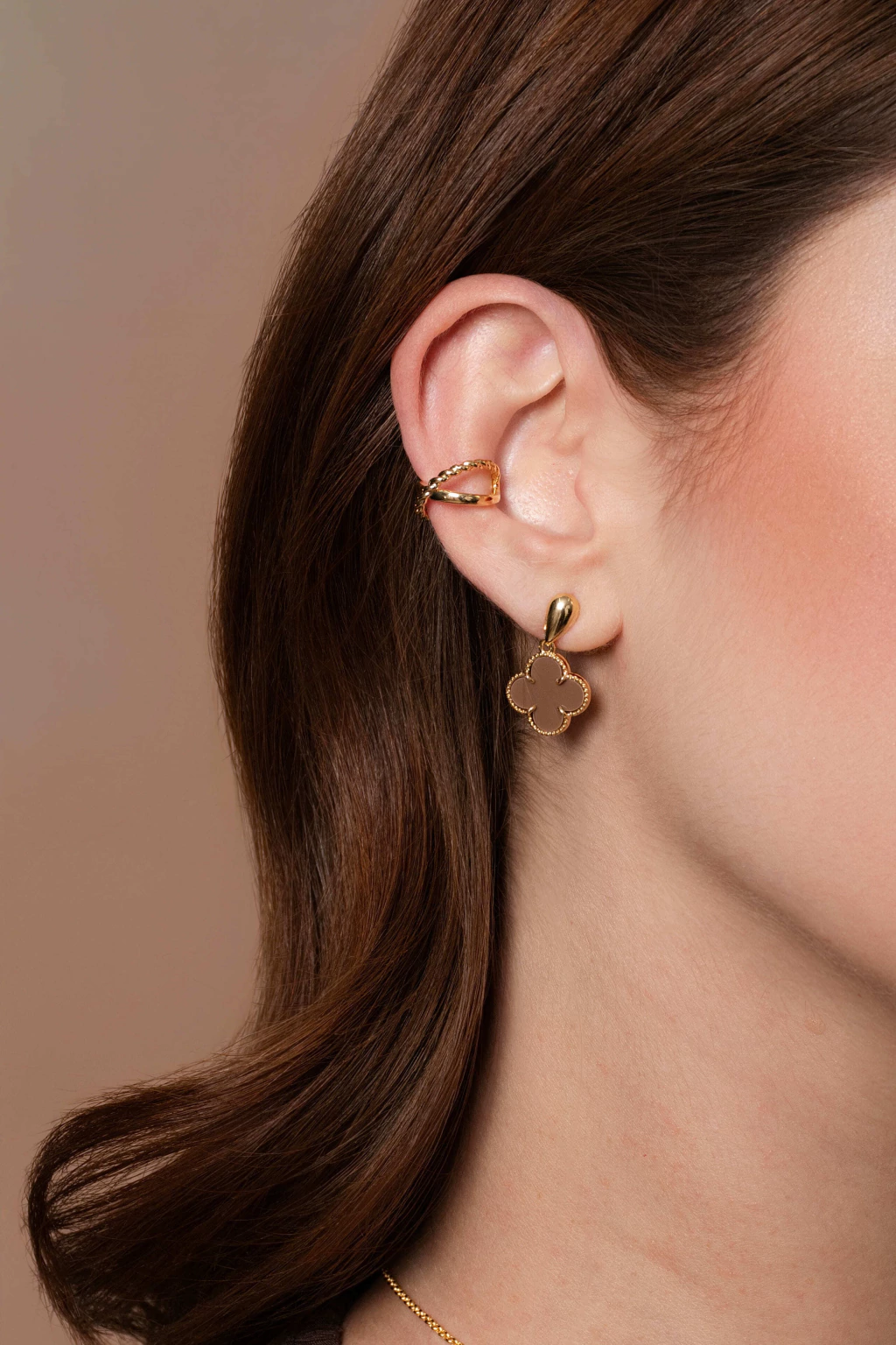 O Brinco Trevo Marrom Pendente é a mistura perfeita entre delicadeza e significado. O trevo, símbolo de sorte e boas vibrações, ganha vida com o tom marrom elegante da pedra, que traz uma sensação de sofisticação e calor para o visual.