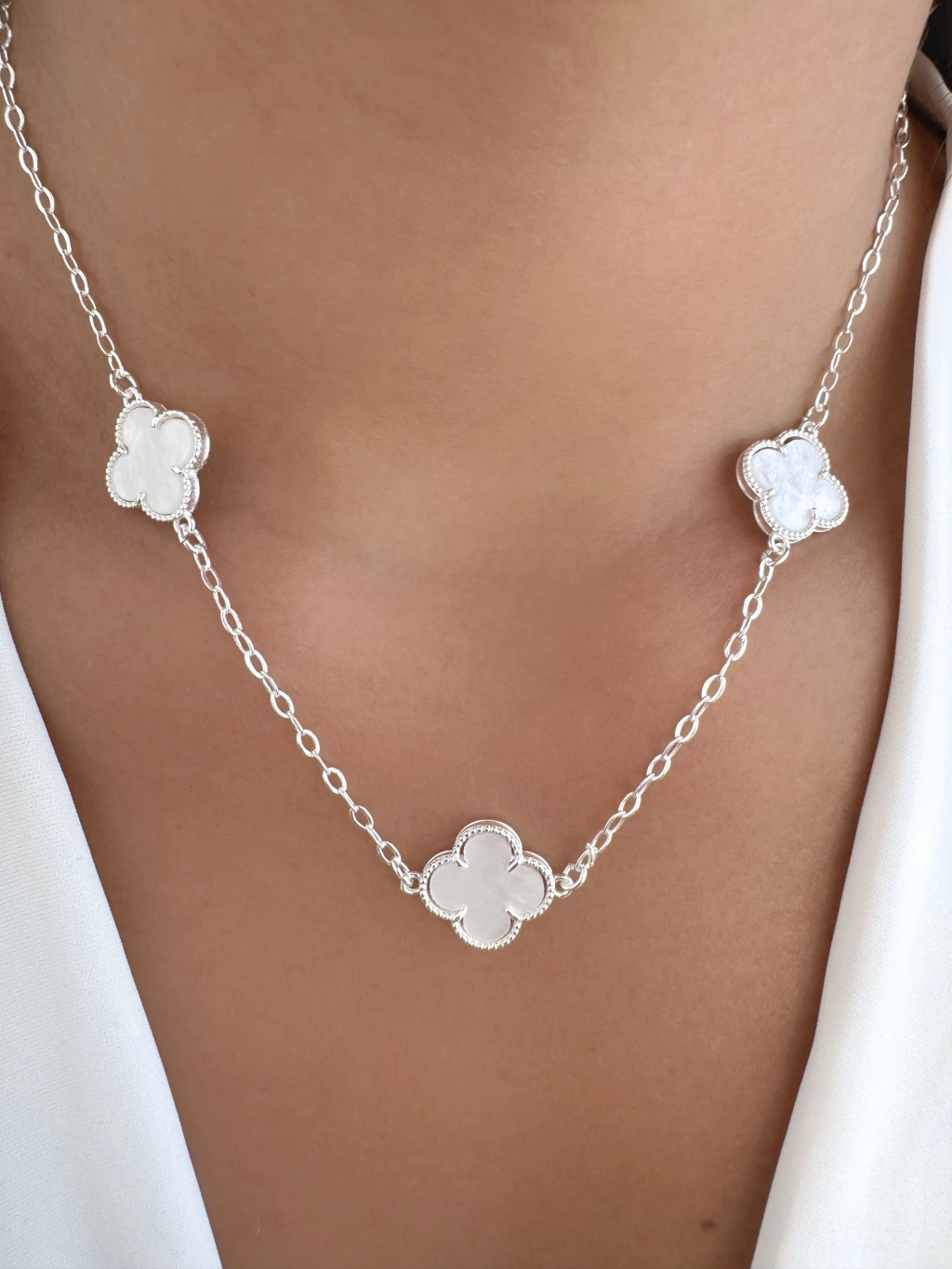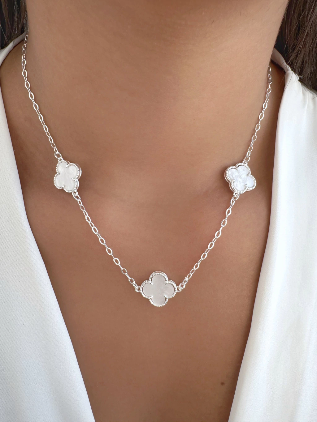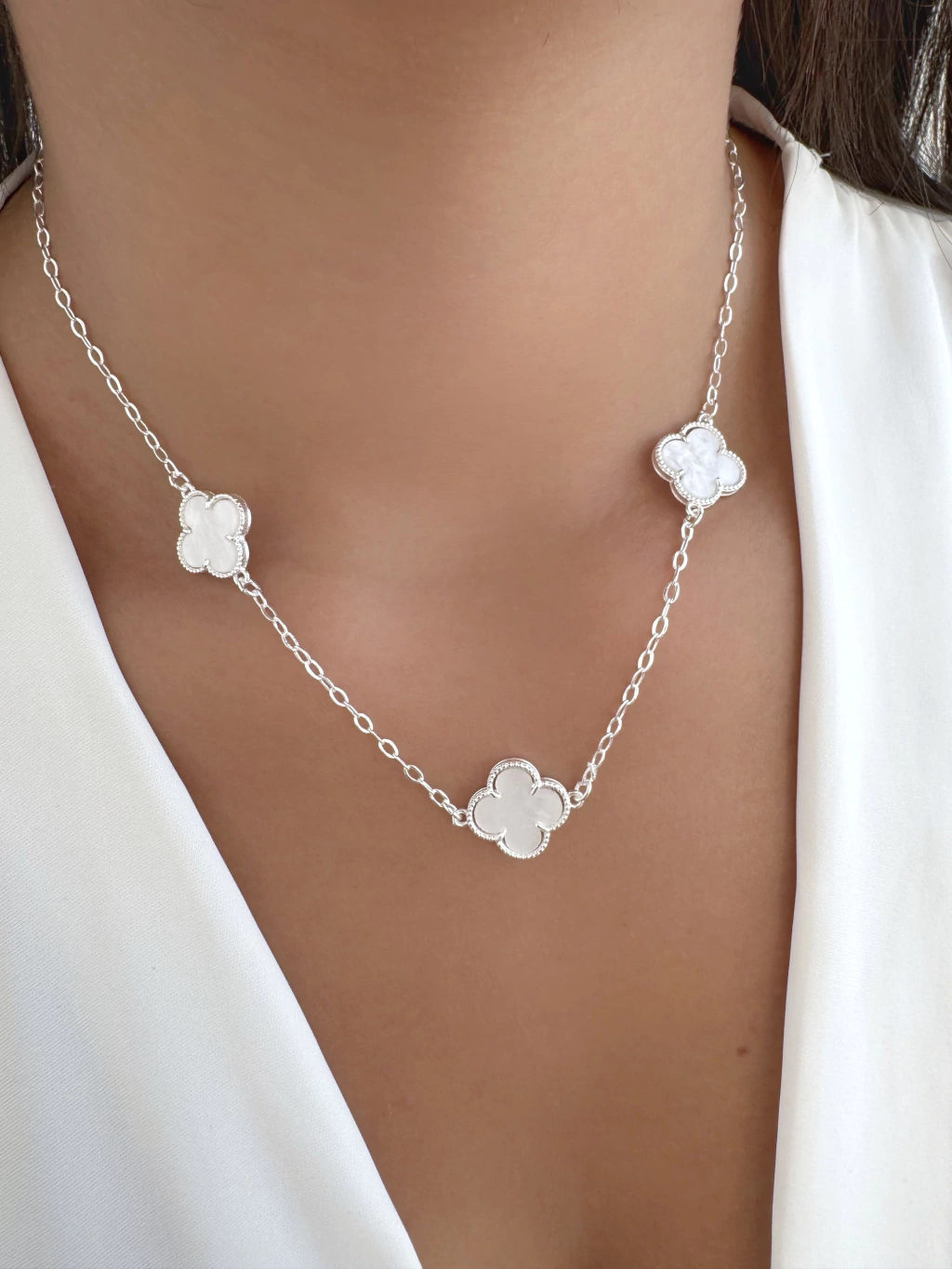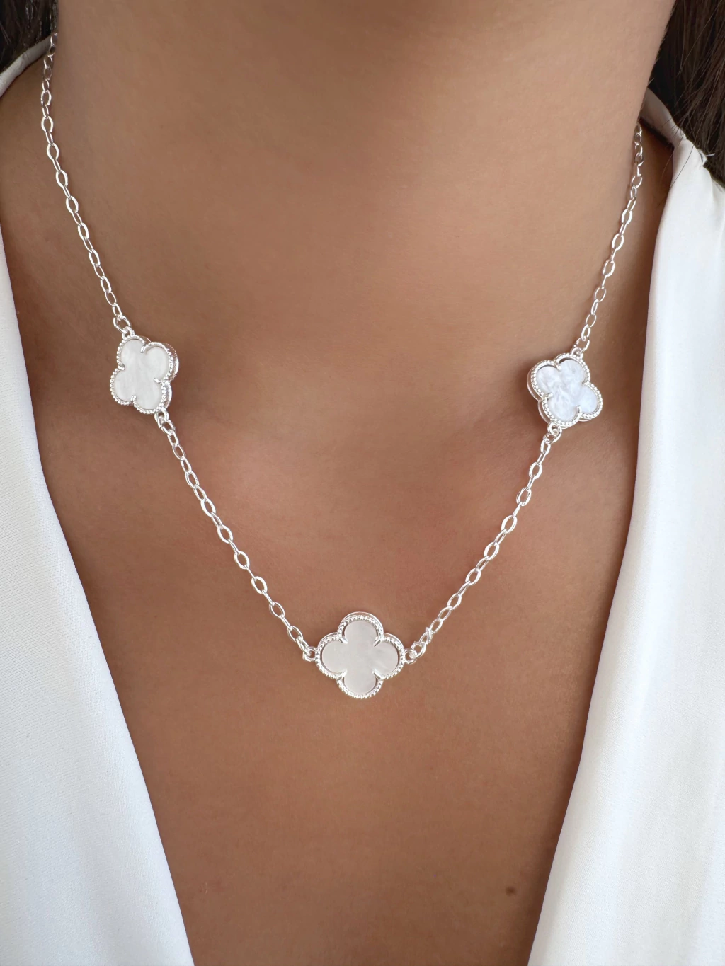 Essa choker com 3 trevos brancos é o acessório perfeito para quem busca elegância e um toque de cor. Com seu design moderno e delicado, ela é ideal para compor looks sofisticados e estilosos. Banhada a prata, a peça é um verdadeiro charme, perfeita para o dia a dia ou ocasiões especiais. O detalhe dos trevos traz uma vibe de sorte e boas energias, deixando o visual ainda mais especial.