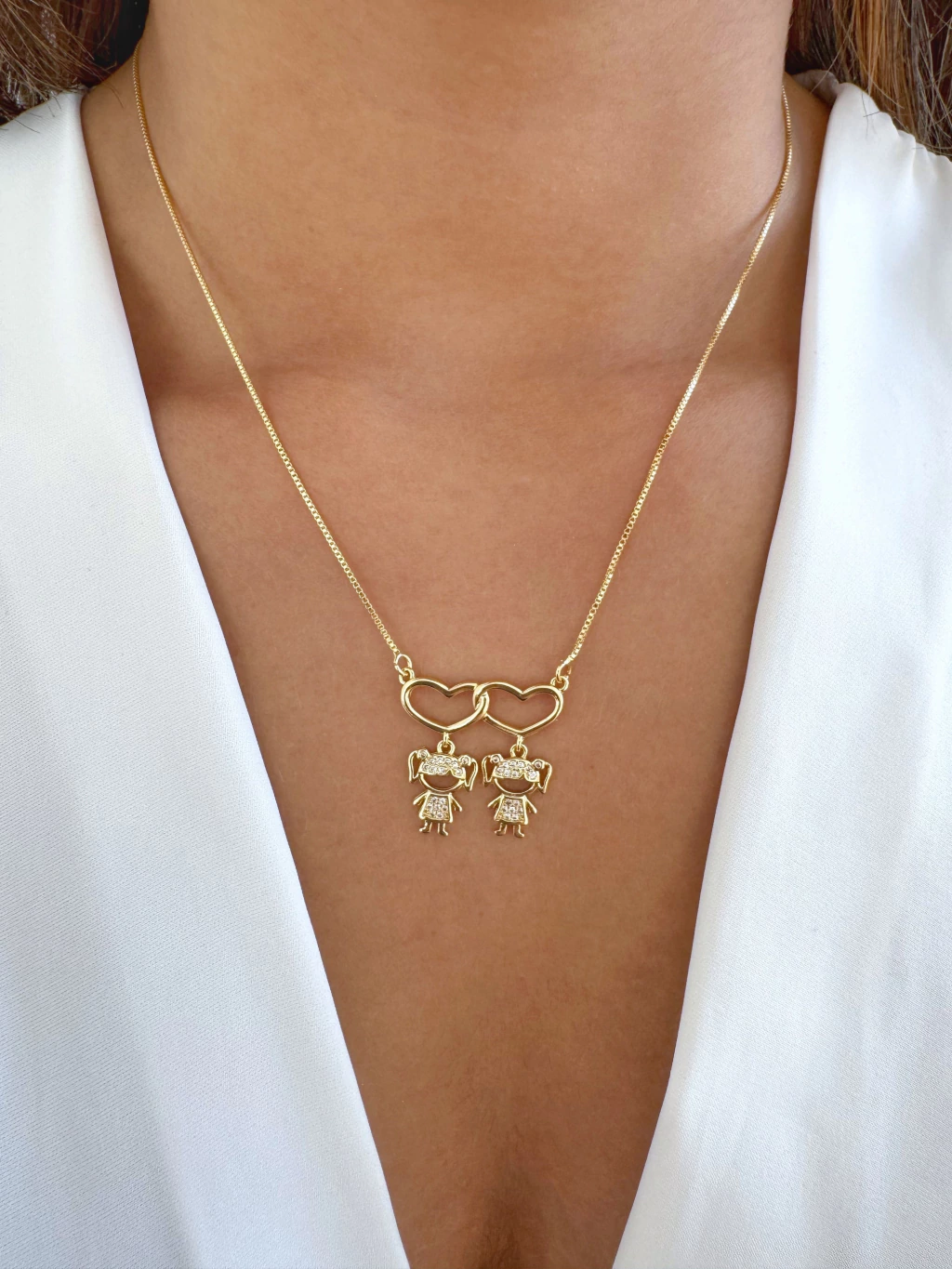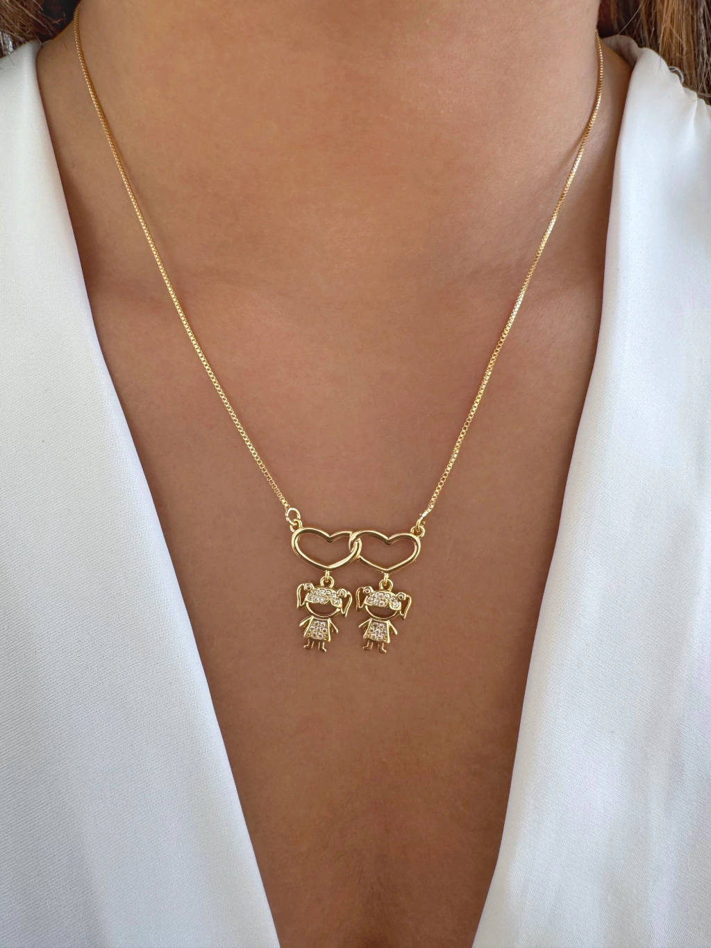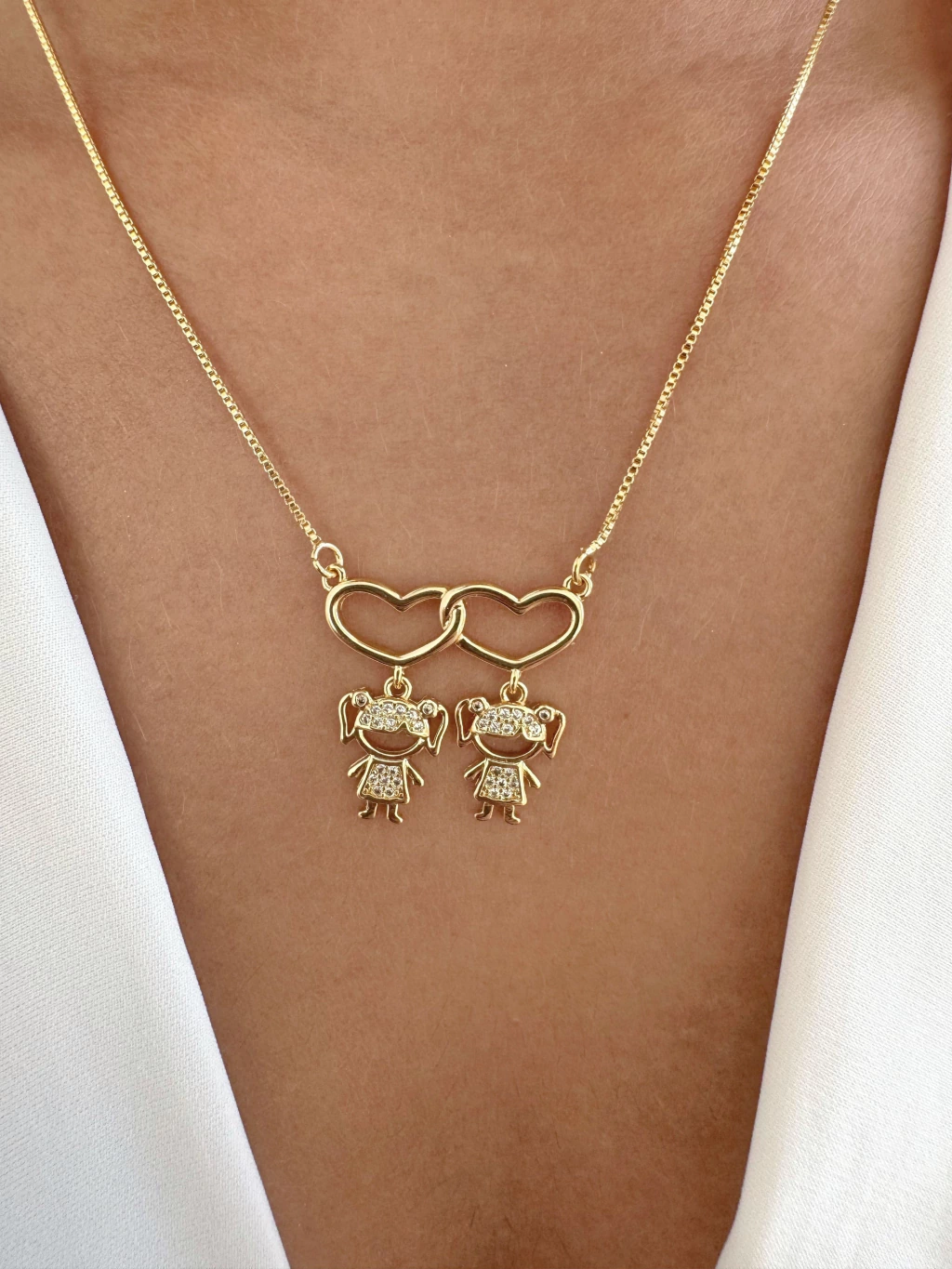 Um colar cheio de significado e carinho, o Colar 2 Meninas Pendentes é perfeito para representar o amor e a conexão com os filhos. Cada pingente em formato de menina traz delicadeza e simbolismo, formando uma peça especial que vai além do acessório: é uma joia afetiva que acompanha momentos e histórias. Banhado a ouro, combina brilho e sofisticação, sendo ideal para usar no dia a dia ou em ocasiões especiais.