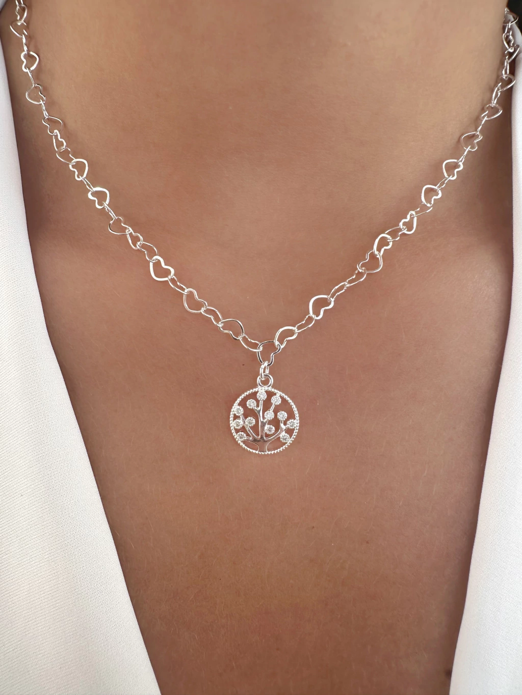 Colar Árvore da Vida Cravejada com Corrente Elos Coração - Banhado a Prata