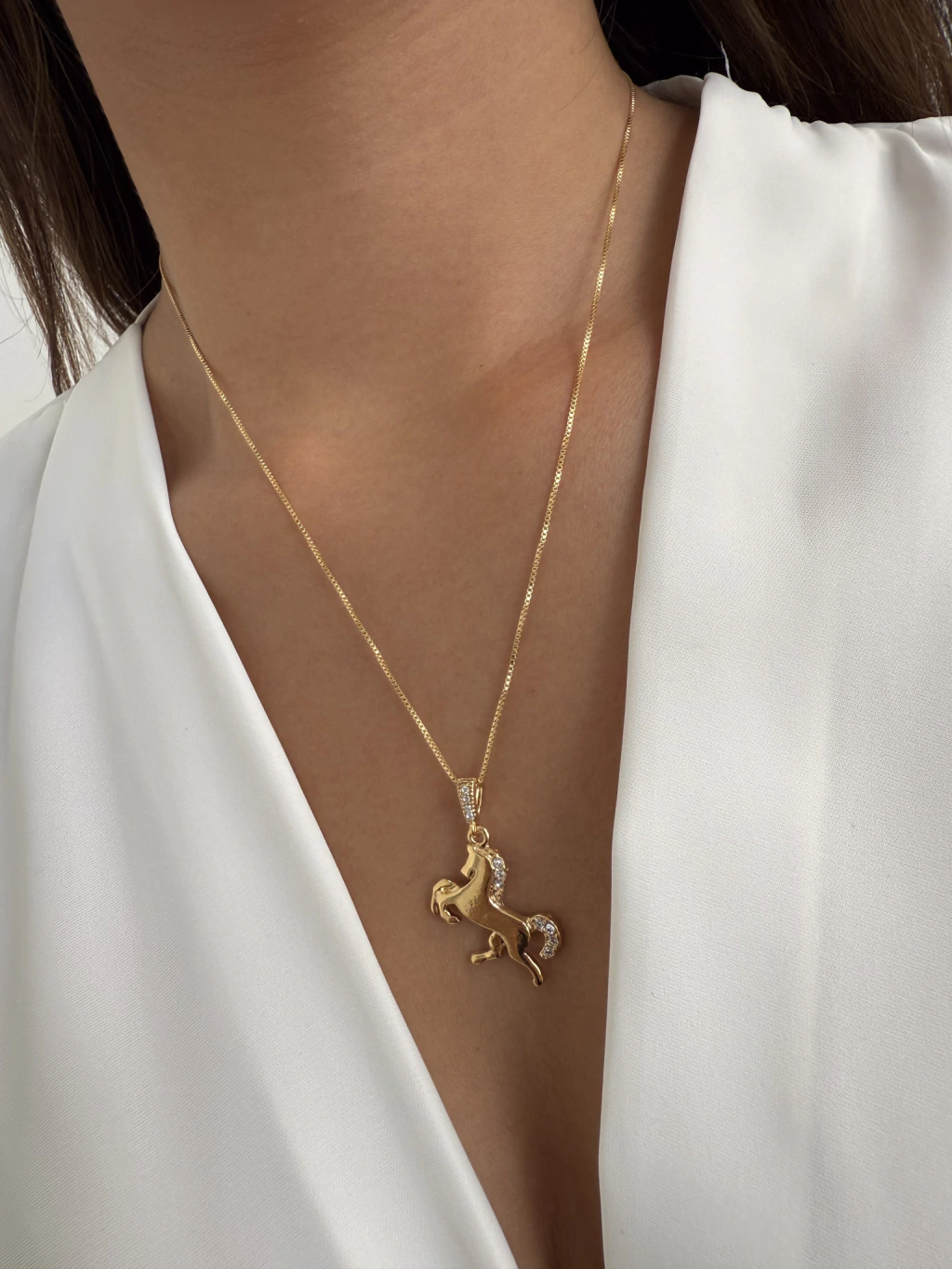 Um colar que une elegância e paixão pelo universo equestre. O pingente em forma de cavalo, todo cravejado com micro zircônias, transmite força, liberdade e nobreza em cada detalhe. É uma peça que valoriza a delicadeza sem perder o impacto visual, perfeita para quem carrega o amor pelos cavalos no coração.