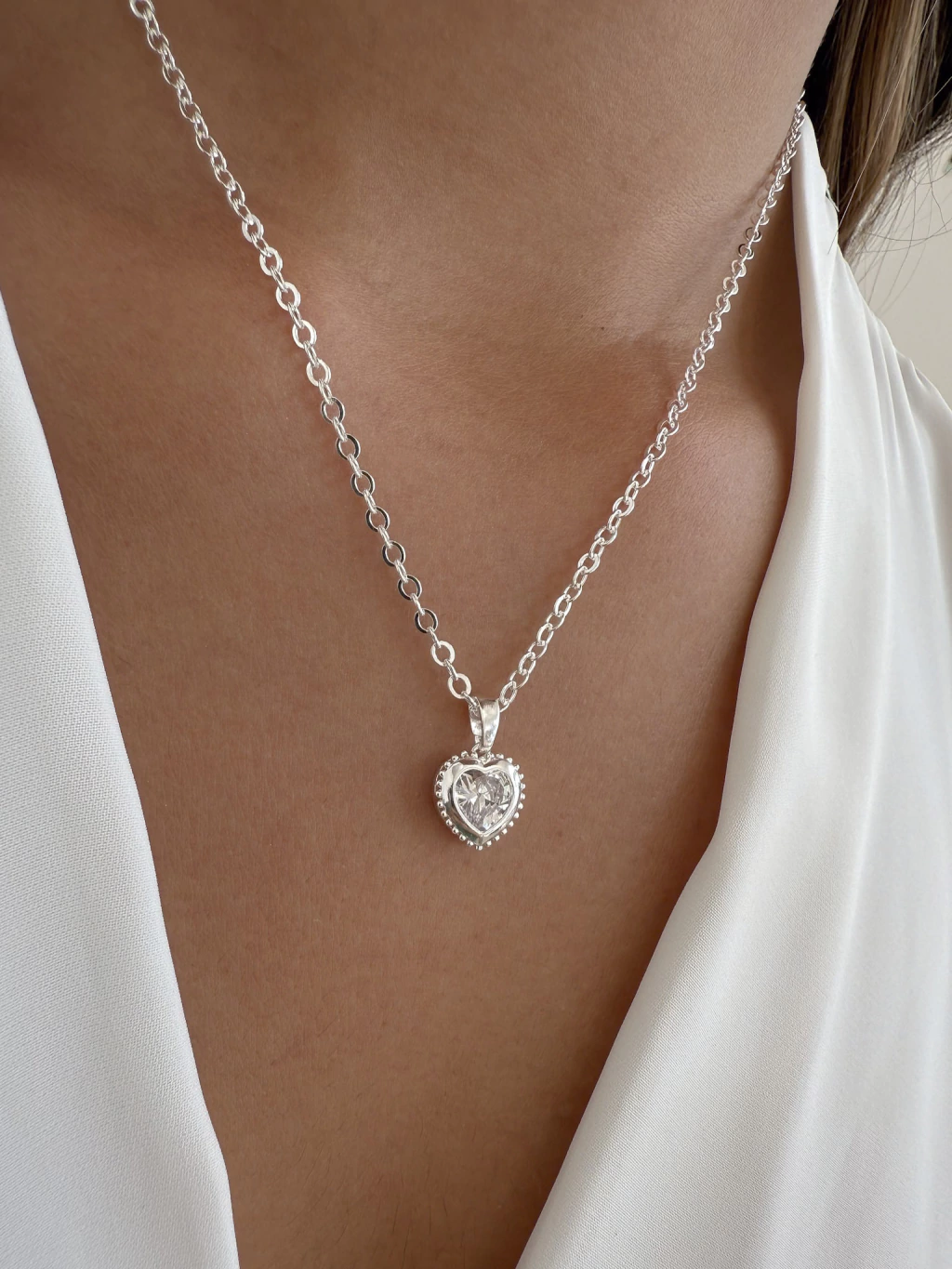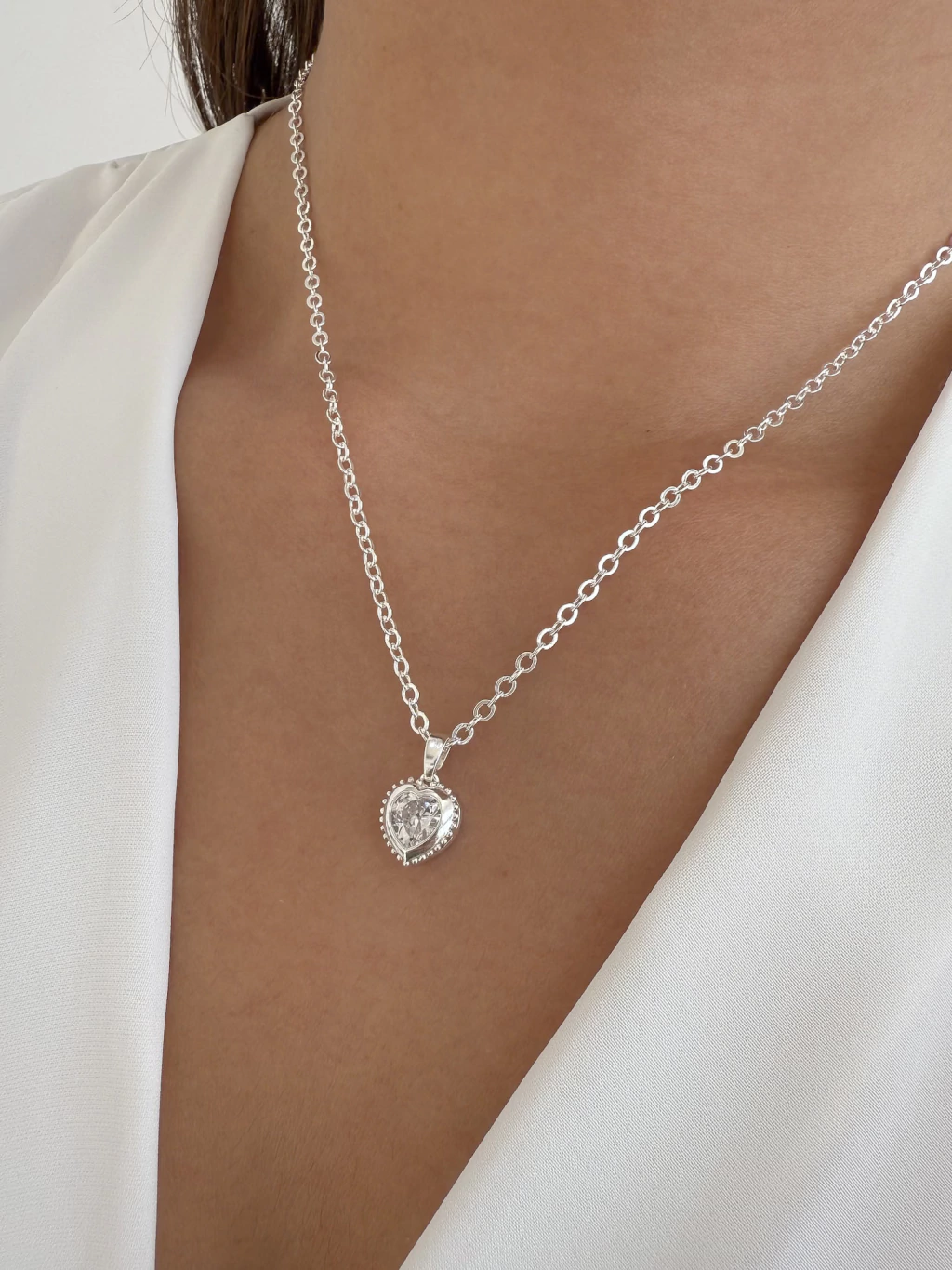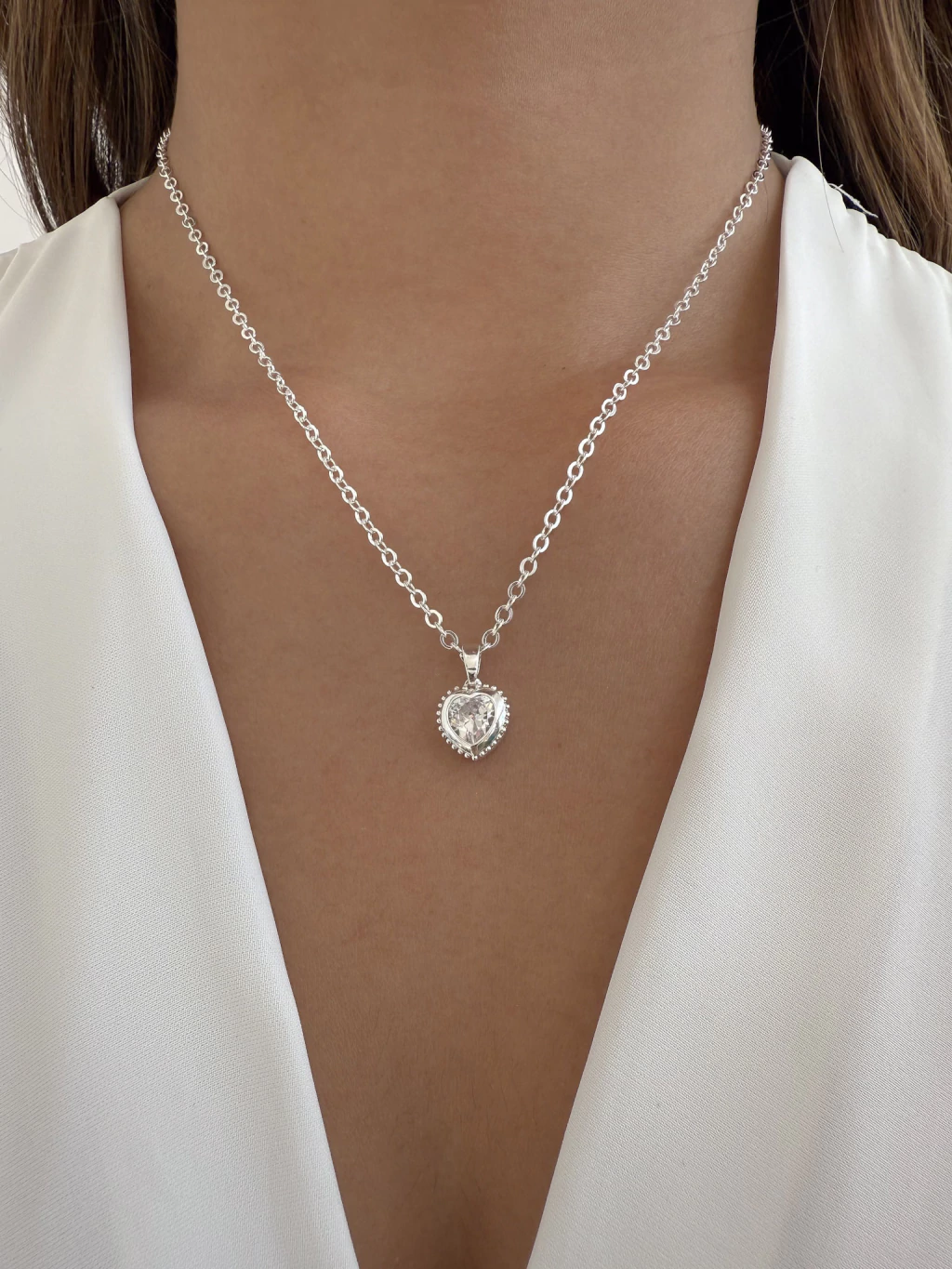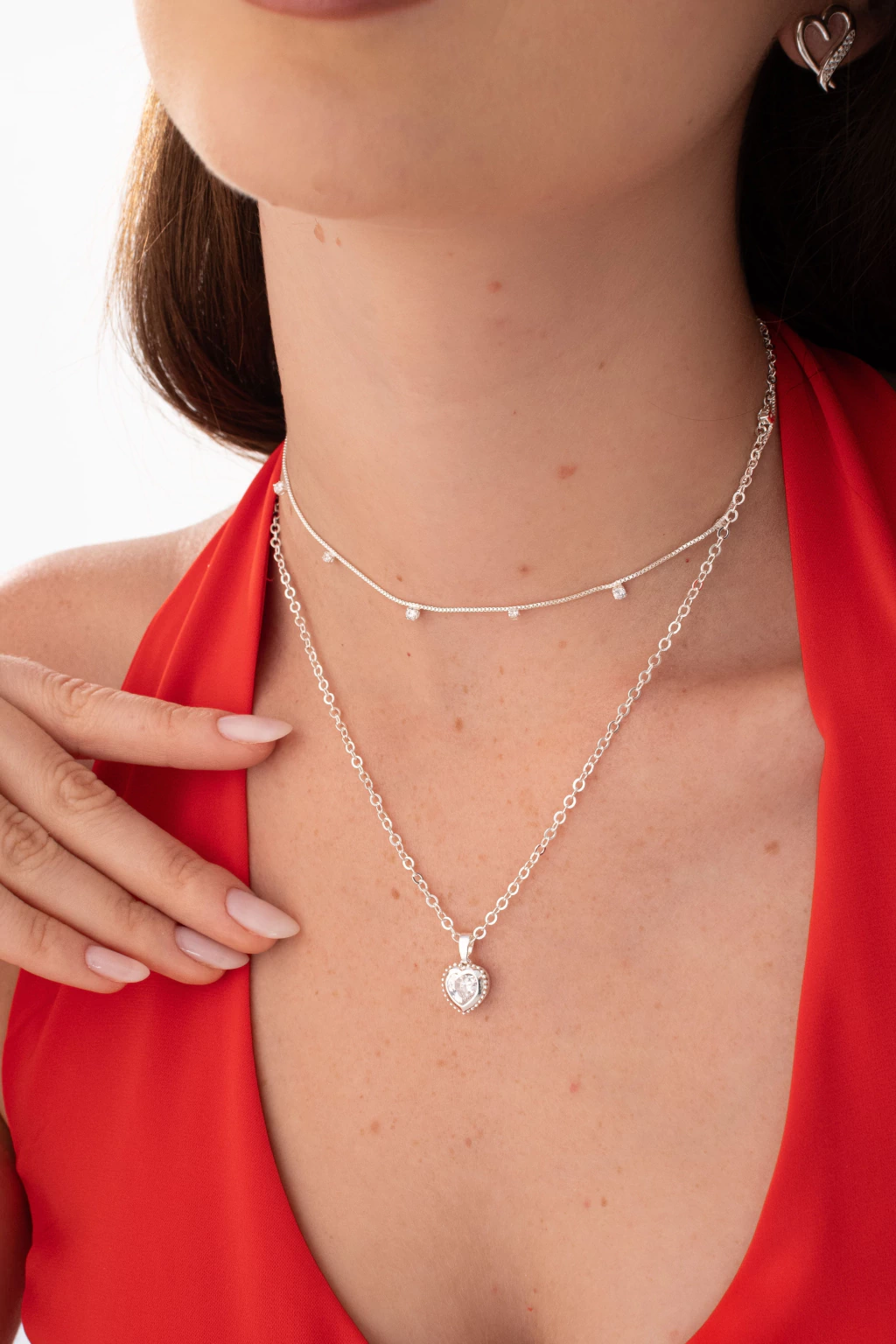 Colar Coração Cristal Detalhado - Banhado a Prata