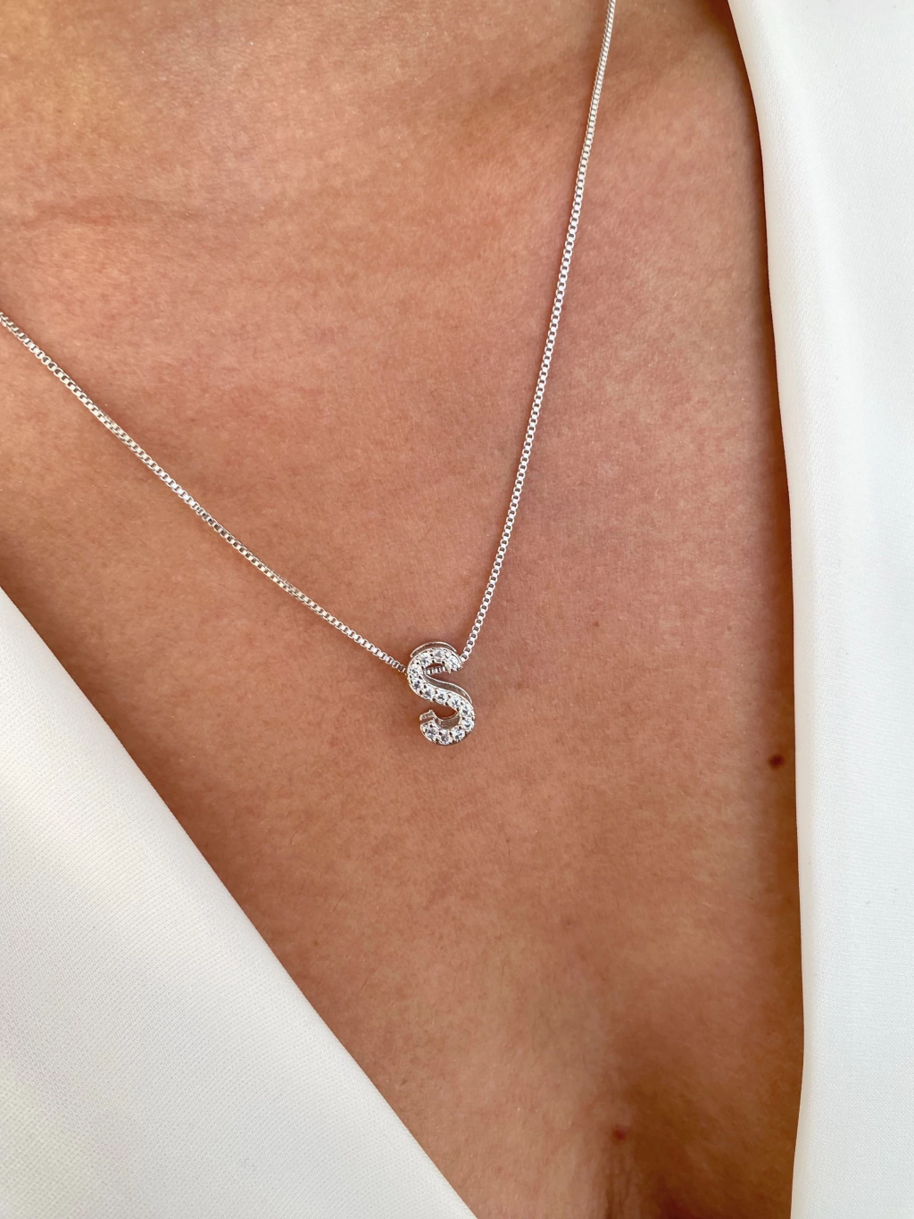 Colar de Letra S Cravejada - Banhado a Ródio Branco