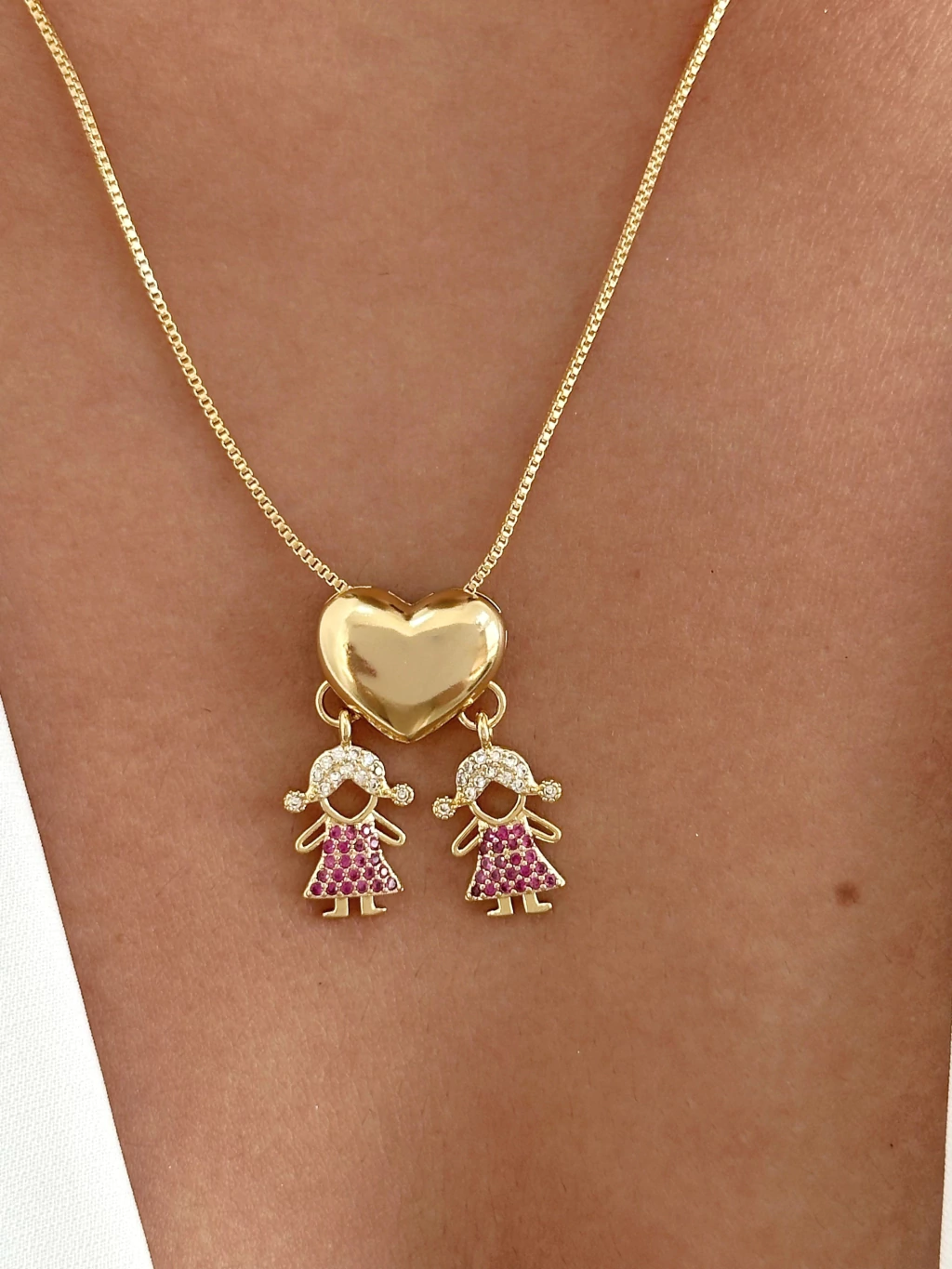 Colar Filhos Duas Meninas com Coração - Banhado a Ouro