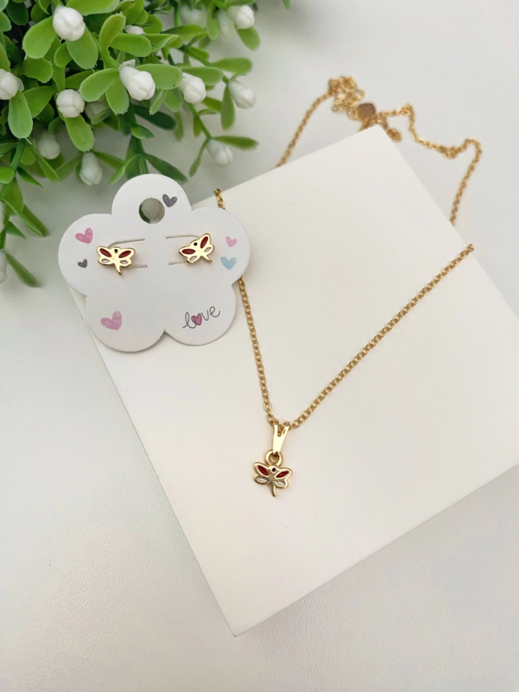 Cores chamam atenção das crianças, né?! Sua menina vai se apaixonar pelo nosso colar de libélula, uma peça juvenil e delicada para deixar ela ainda mais charmosa! Temos brincos para combinar ainda!