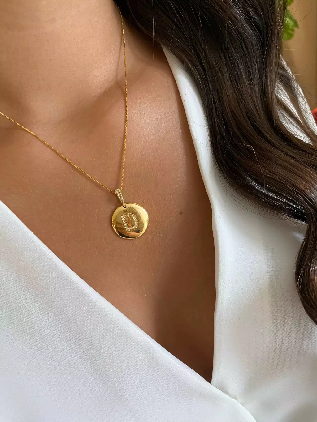 Colar com 47cm + 10cm de extensor, pingente cravejado de microzircônias com 20mm de diametro e peso aproximado de 6.5g. A peça possui tecnologia antialérgica e garantia de 12 meses para o banho