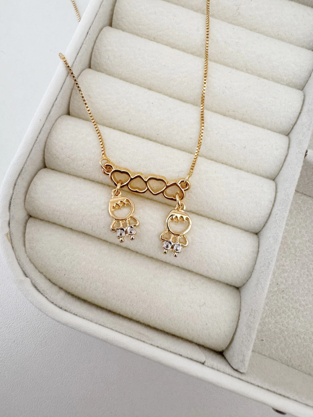 O Colar Mãe de Meninos com Corações une delicadeza, significado e sofisticação em uma peça banhada a ouro e com um design exclusivo: dois meninos pendentes conectados a corações, simbolizando a ligação eterna entre mãe e filhos.