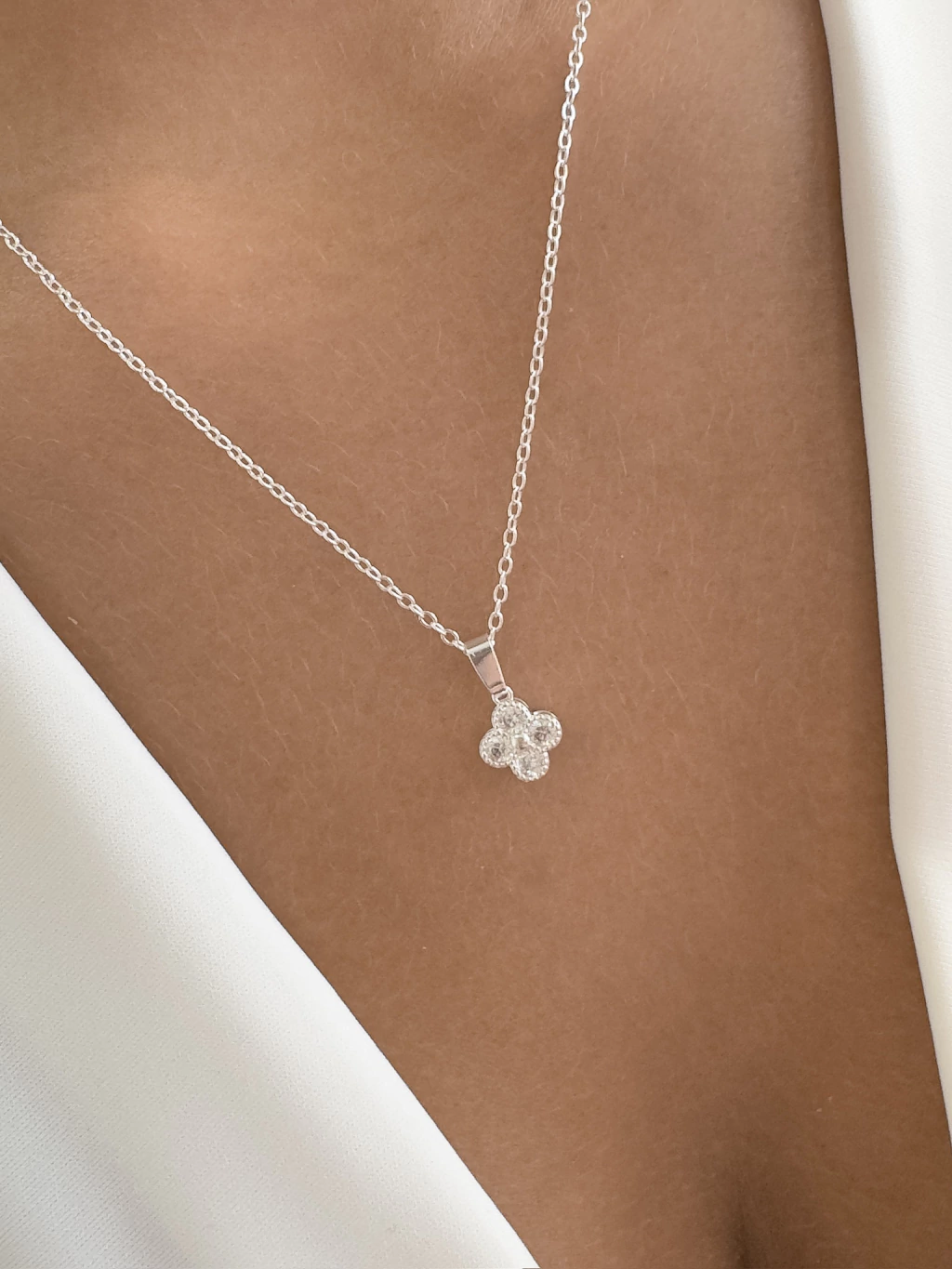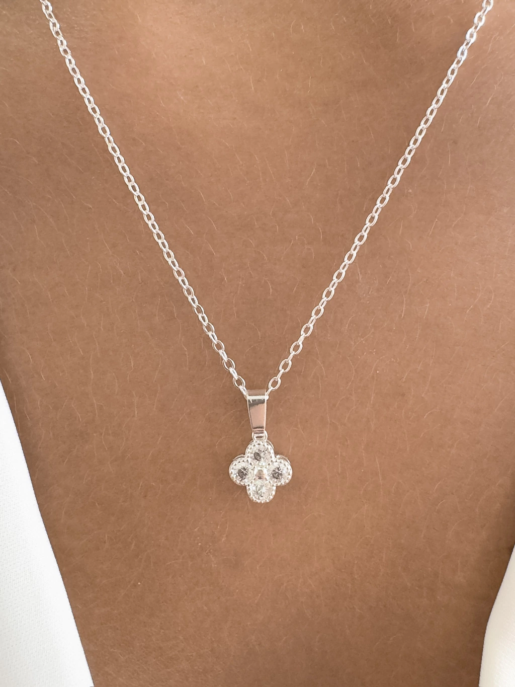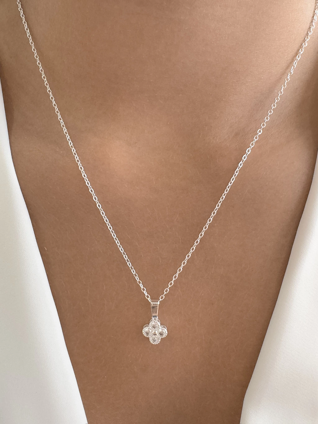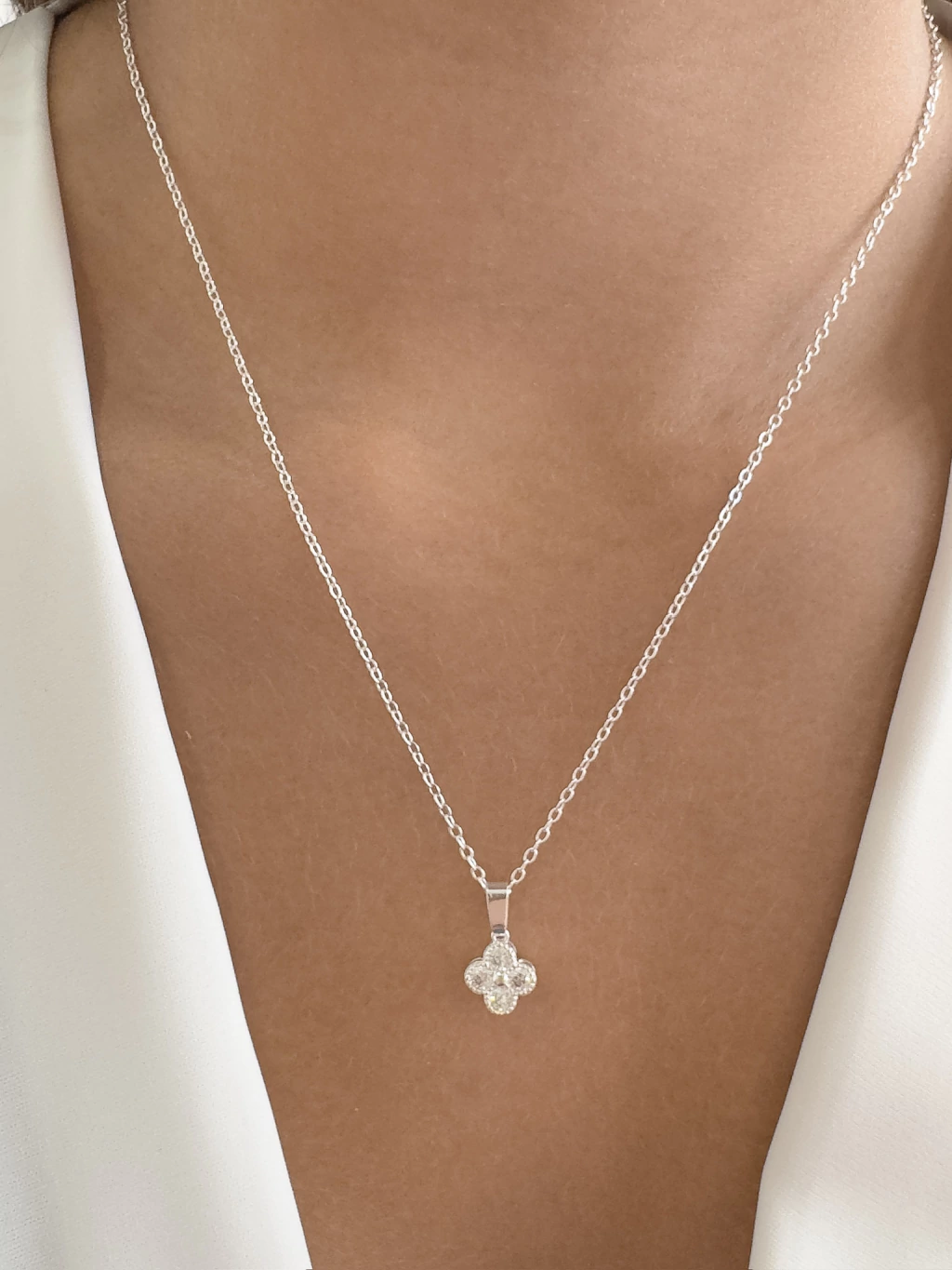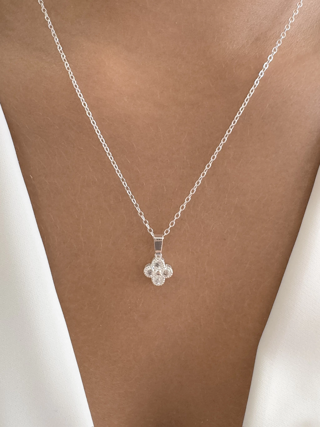 Colar Trevo Cravejado Zircônias - Banhado a Prata