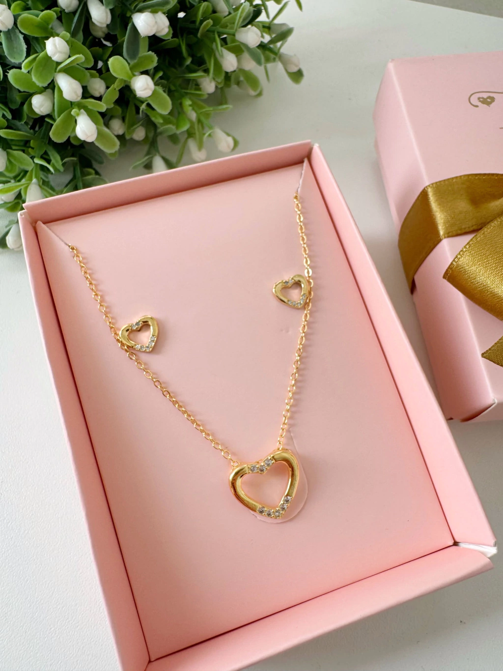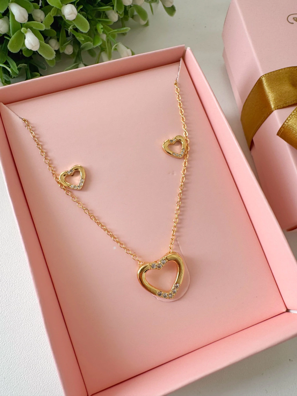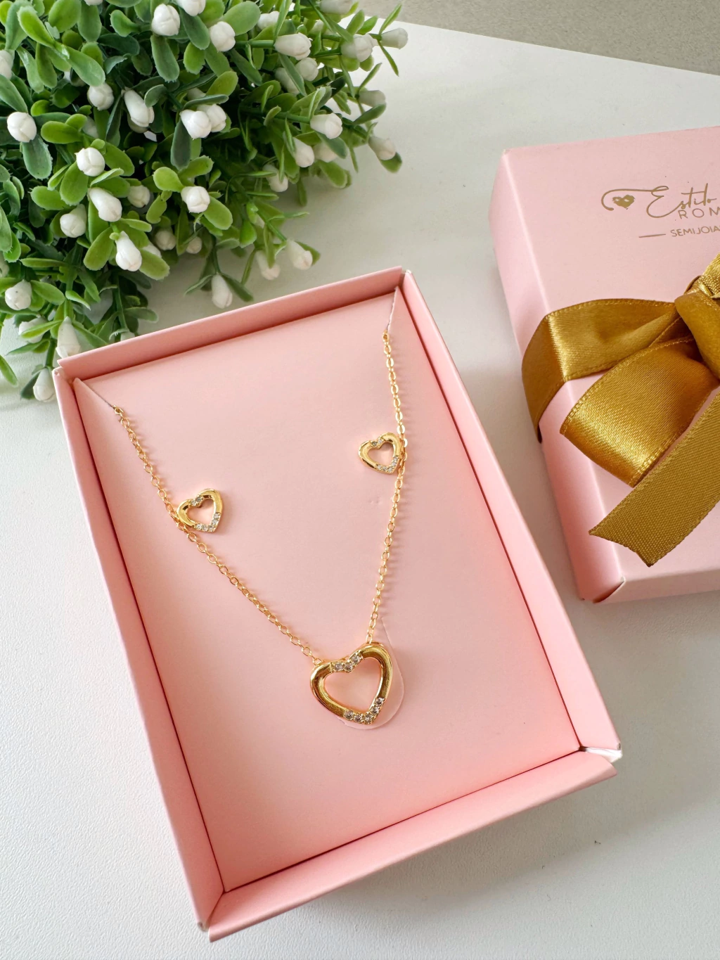 Conjunto Coração Vazado com Detalhe de Microzircônias Banhado a Ouro