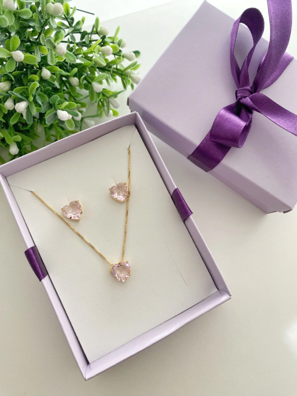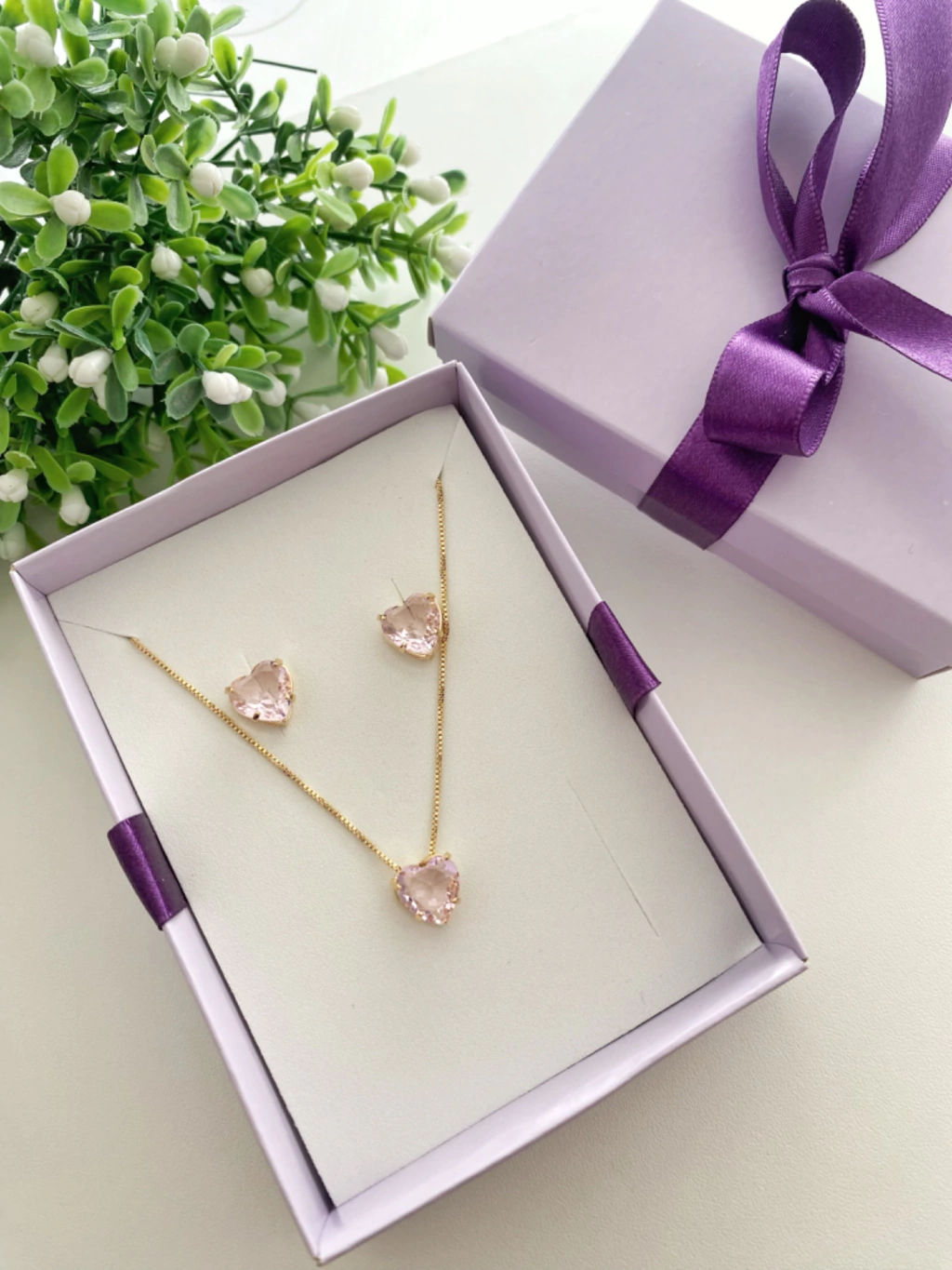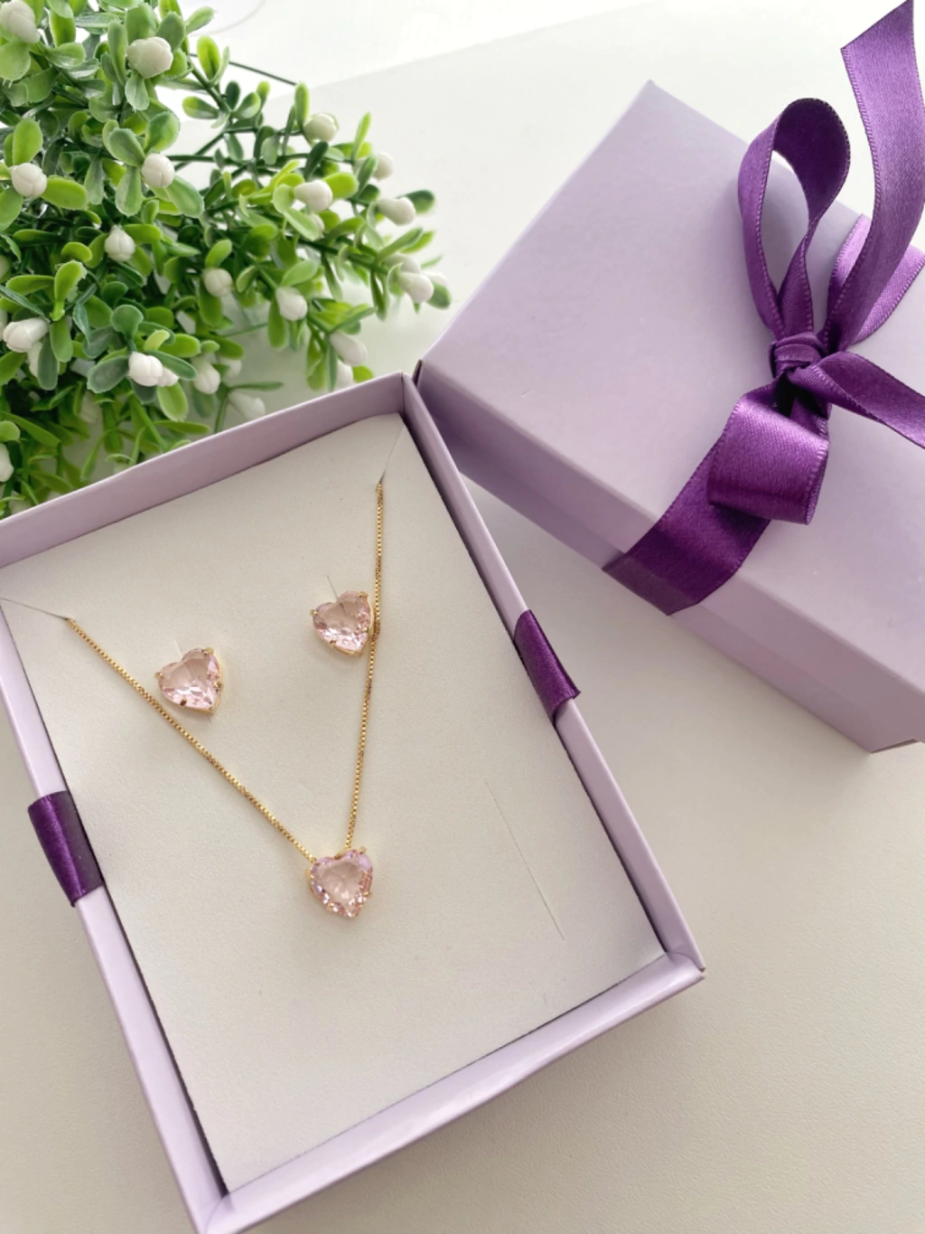 Corrente com 45cm + 5cm, pingente de Coração Cravejado 10x10mm (AxL), em conjunto com brinco de Coração com as mesmas dimensões do pingente.