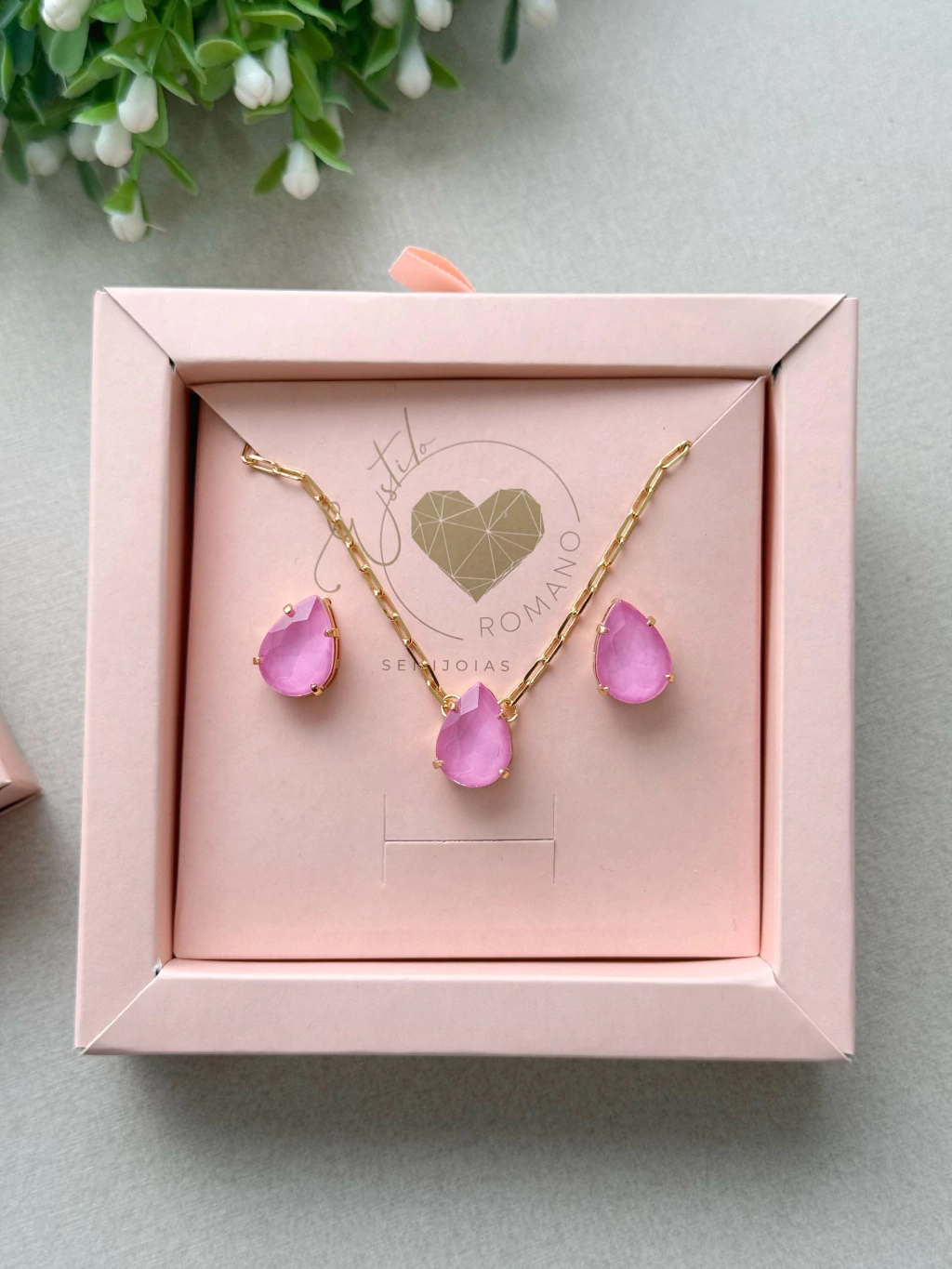 Um charme delicado com aquele toque romântico que a gente ama! Esse conjunto com zircônias em formato de gota na cor rosa é perfeito pra quem busca leveza e elegância em uma só peça. O banho em ouro realça ainda mais o brilho das pedras e traz sofisticação na medida certa. Ideal pra usar no dia a dia ou dar um toque especial em ocasiões especiais.
