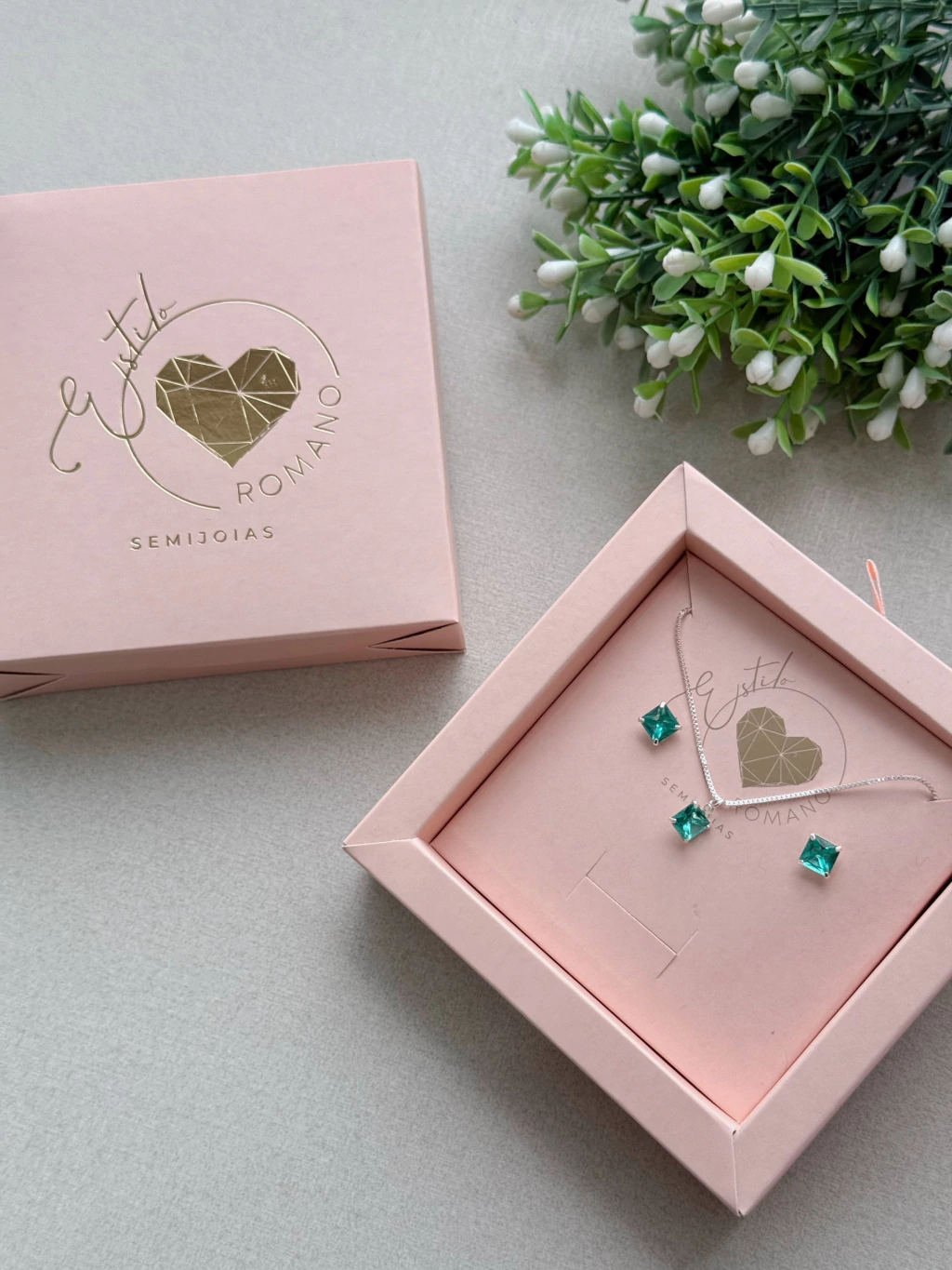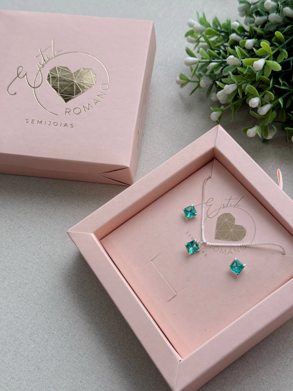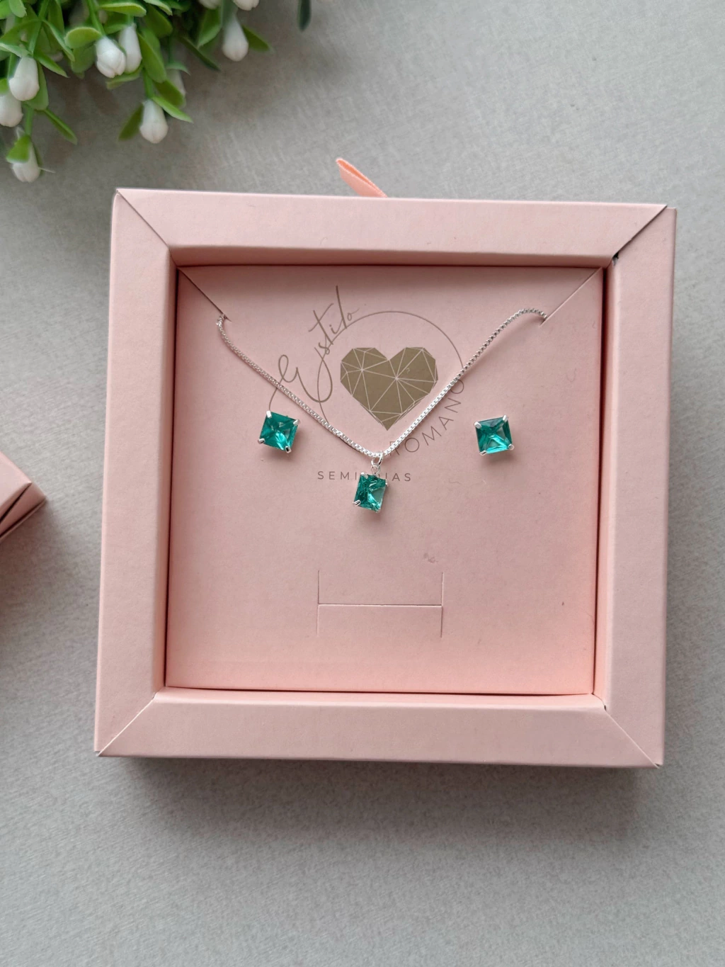 Conjunto Quadrado Zircônia Verde - Banhado a Prata