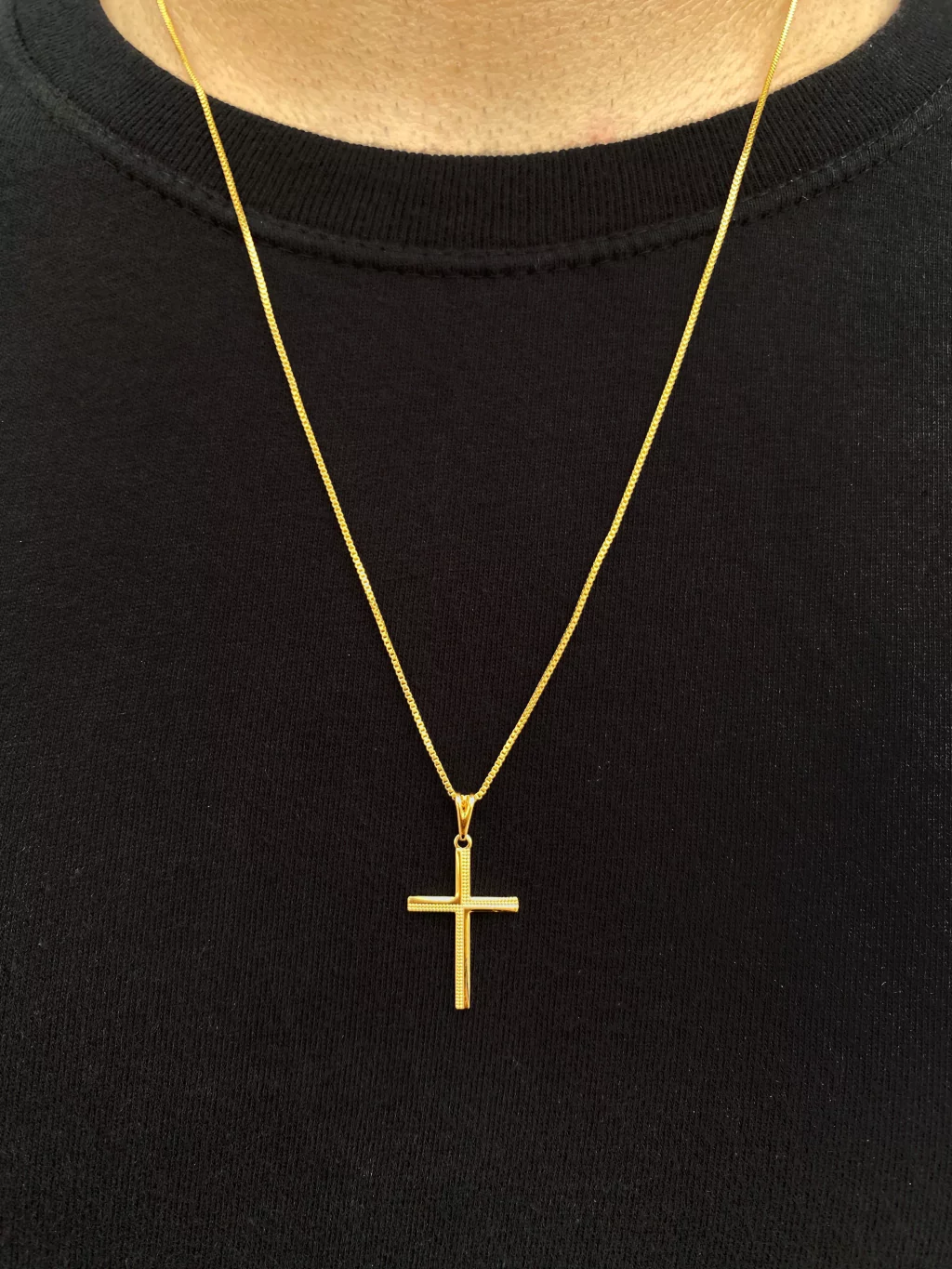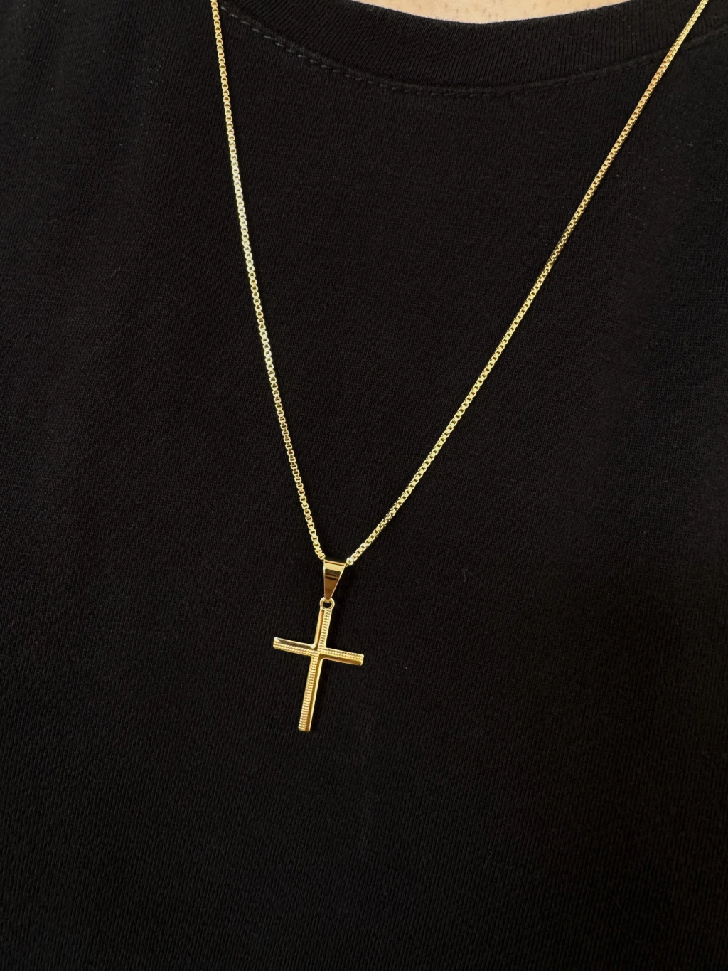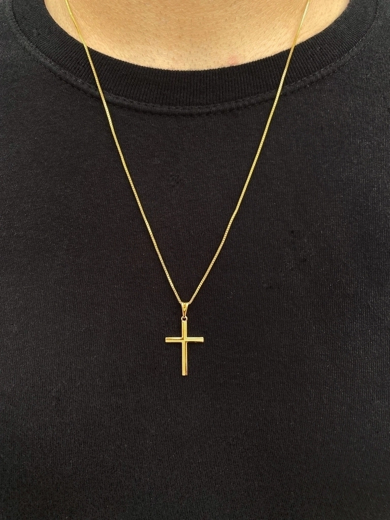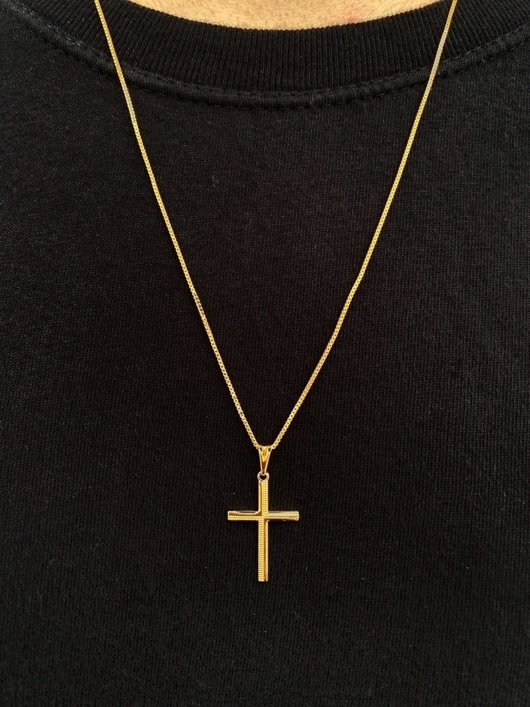 O pingente de 2.5cm x 1.6cm traz uma cruz com detalhes trabalhados, agregando personalidade e elegância ao acessório. O banho de ouro de alta qualidade garante brilho duradouro e resistência ao uso contínuo.