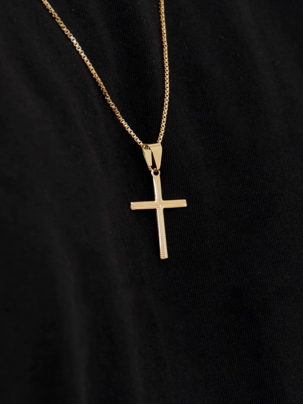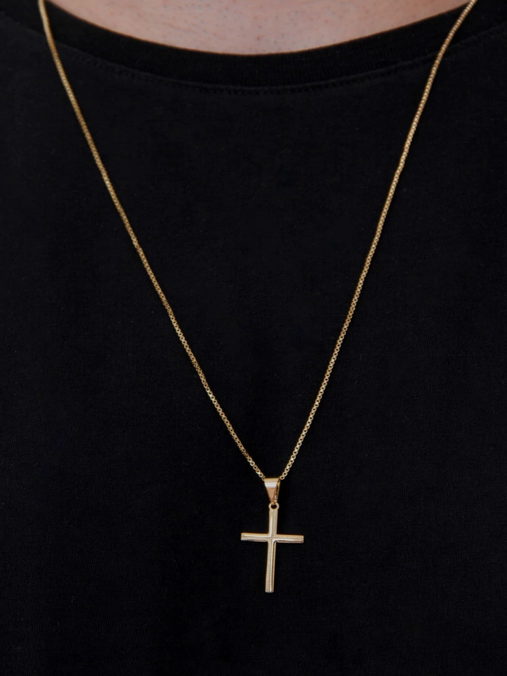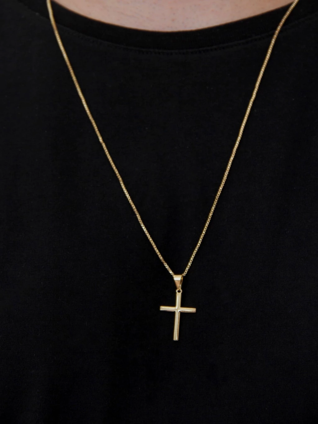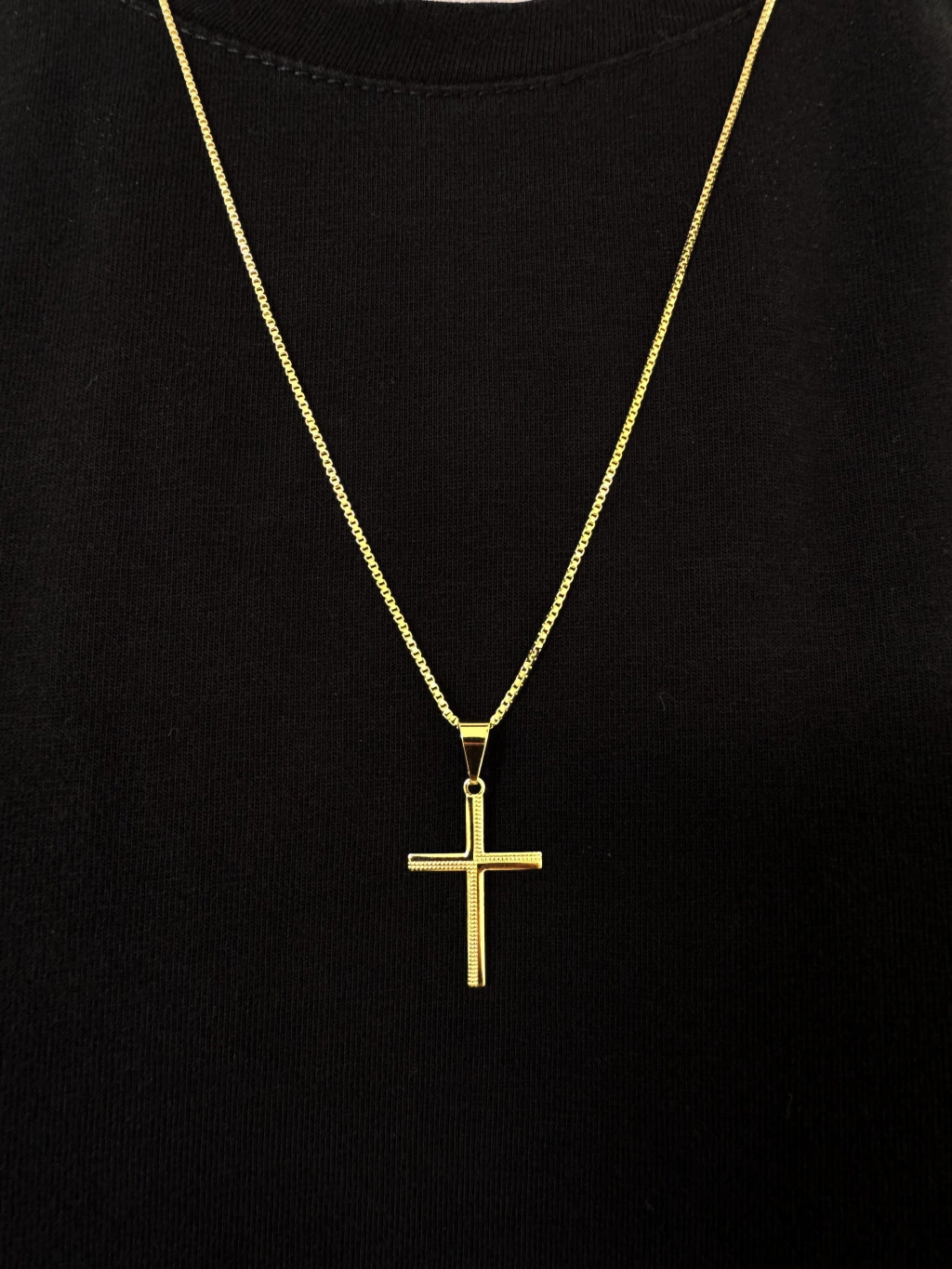 O pingente de 2.5cm x 1.6cm traz uma cruz com detalhes trabalhados, agregando personalidade e elegância ao acessório. O banho de ouro de alta qualidade garante brilho duradouro e resistência ao uso contínuo.