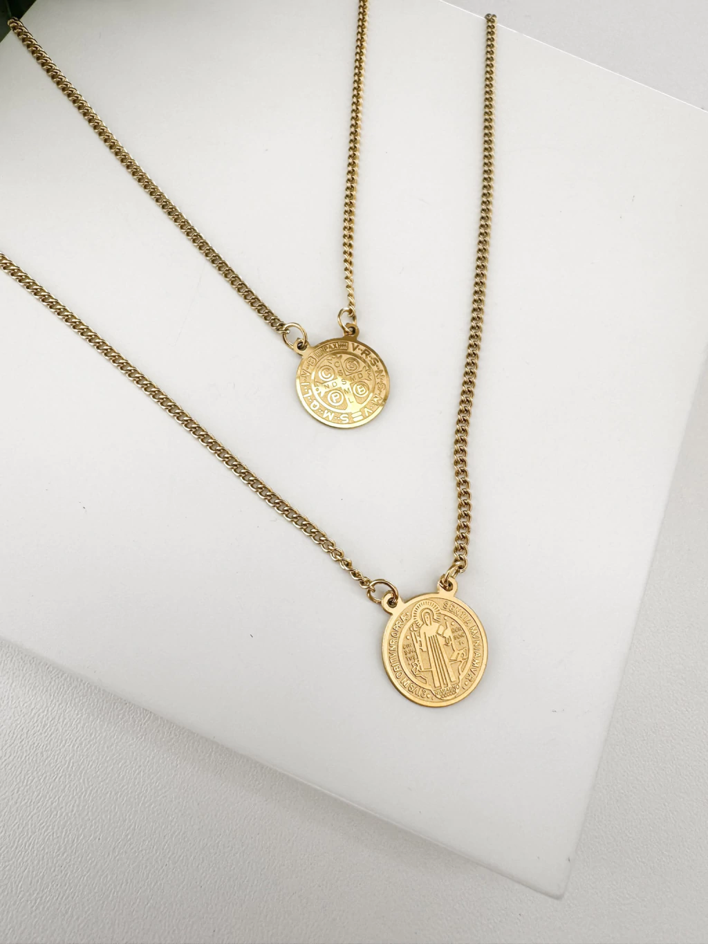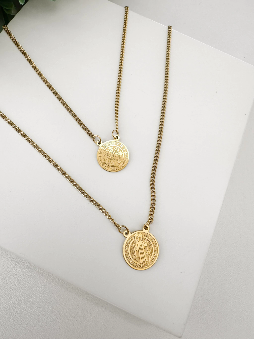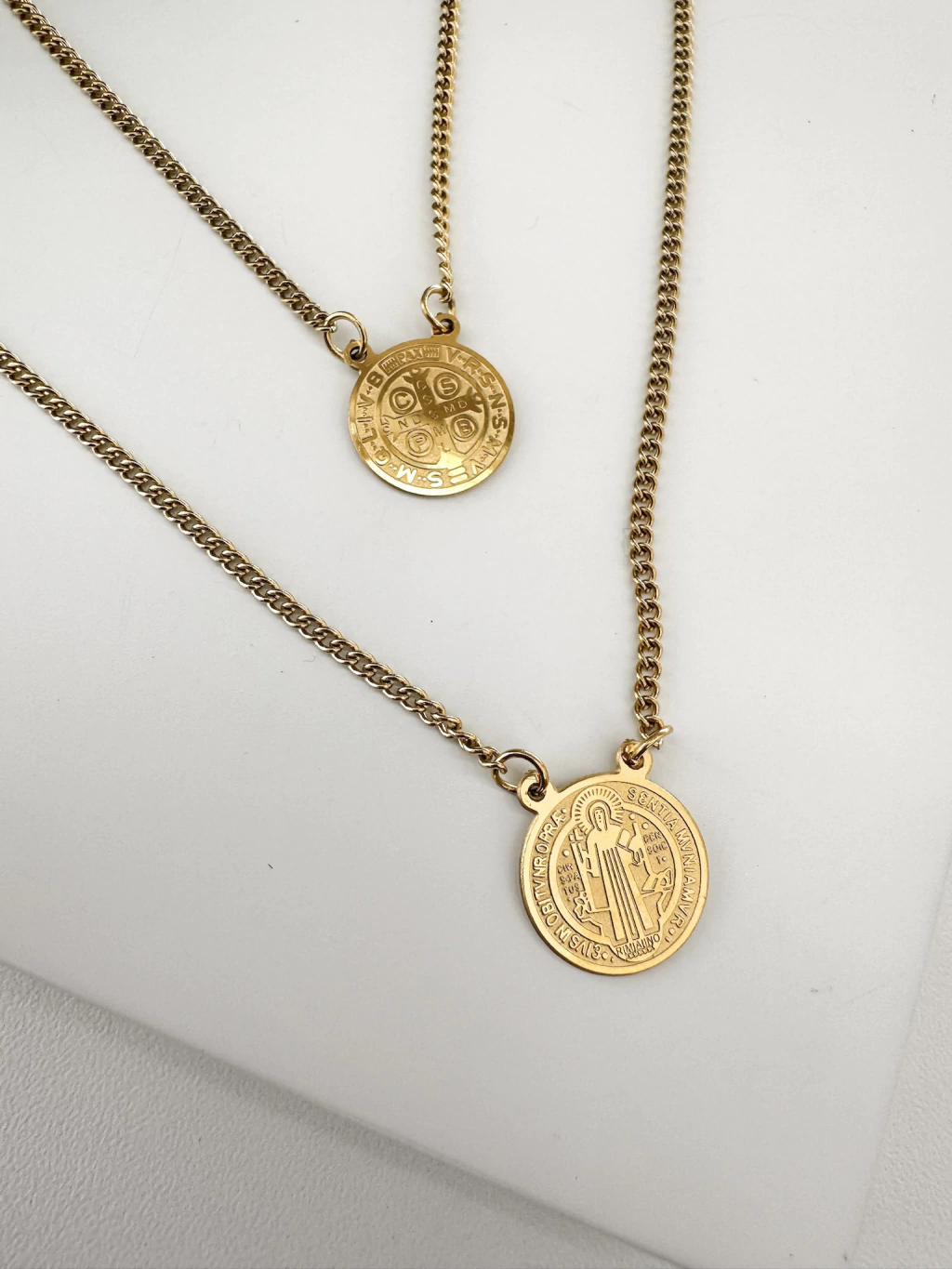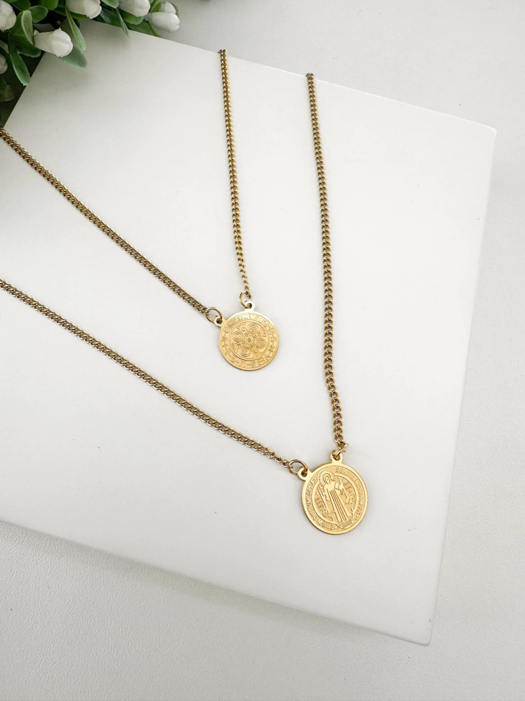 O Escapulário São Bento em Aço Dourado é muito mais que um acessório: é uma joia de fé, proteção e estilo. Com acabamento moderno e resistente, traz os tradicionais símbolos da medalha de São Bento, que representam força espiritual e proteção contra o mal. Um clássico atemporal que une devoção e elegância no mesmo detalhe.