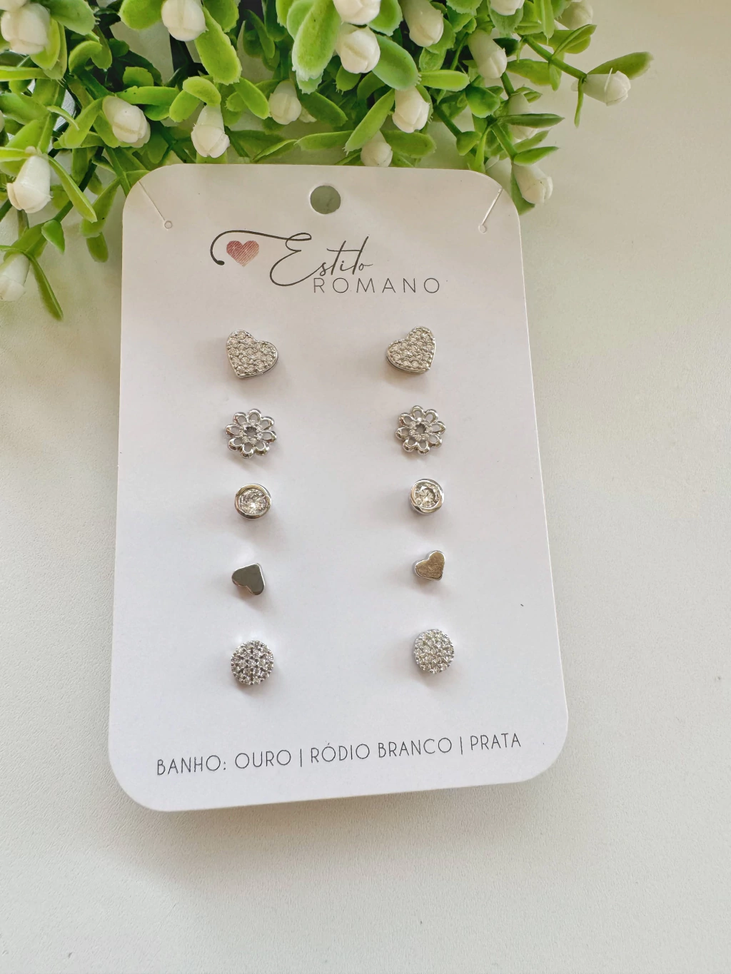 Esse kit com 5 brincos banhados a ródio branco é tudo o que você precisa para variar no estilo sem complicação. Perfeitos para quem gosta de mixar e combinar, eles trazem aquele brilho extra e um toque moderno para qualquer look. Seja para usar todos de uma vez ou trocar conforme o humor do dia, esse kit é um must-have no seu porta-joias.