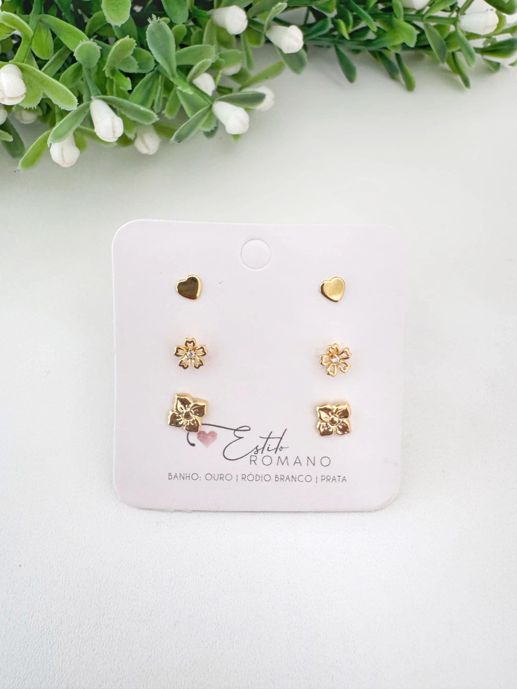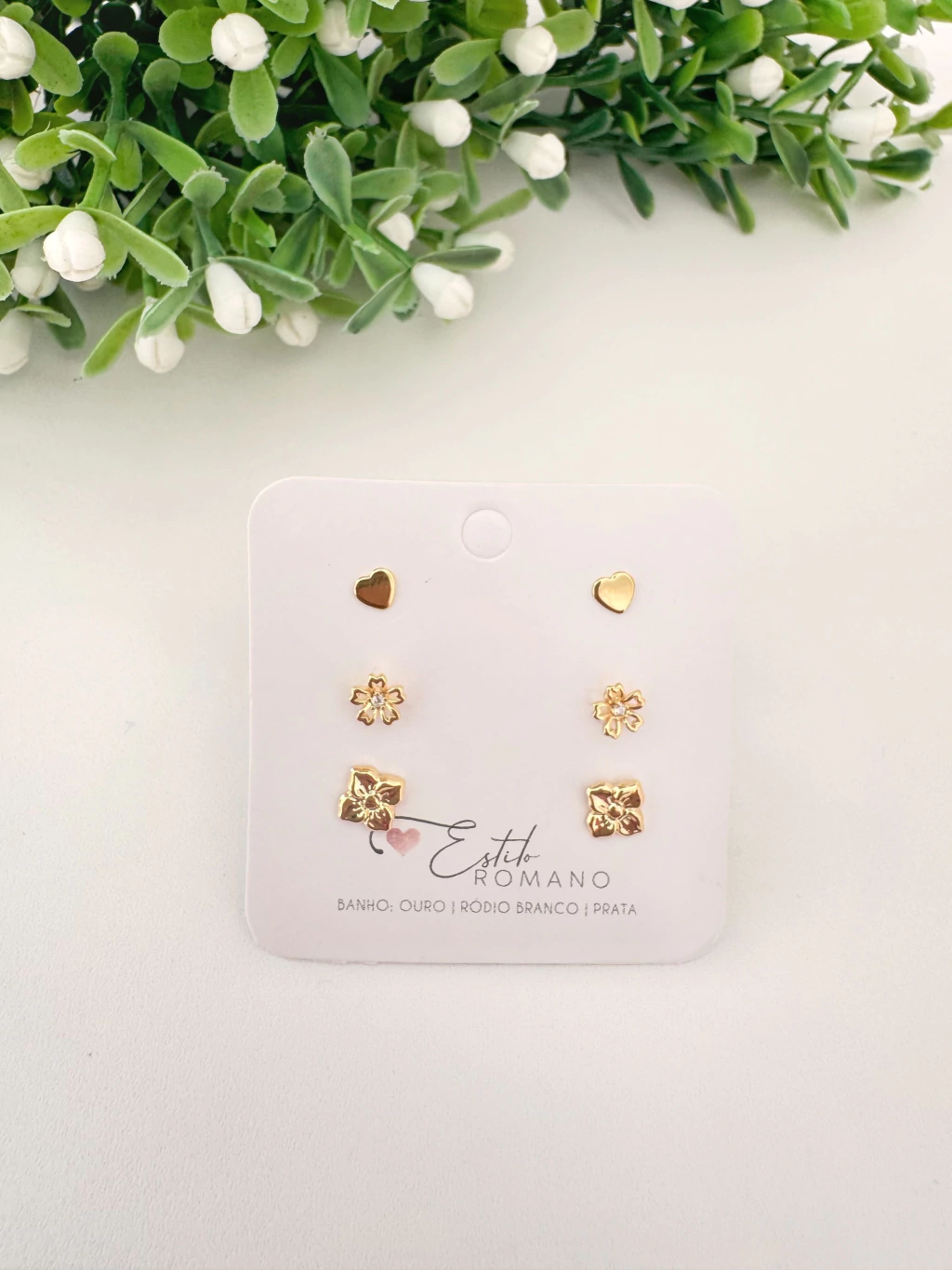Kit Brincos Coração e Flores - Banhado a Ouro