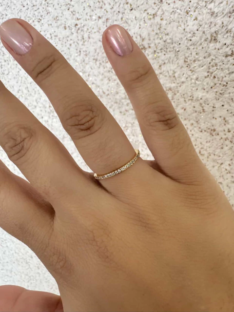 Aneis são aquelas semijoias de luxo que não podem faltar no seu porta-joias. Trazem a elegância e delicadeza desejada, além de dar um up em suas composições em segundos! O Anel Meia Aliança com Microzircônias é perfeito para transmitir toda a graça e beleza que você quer.