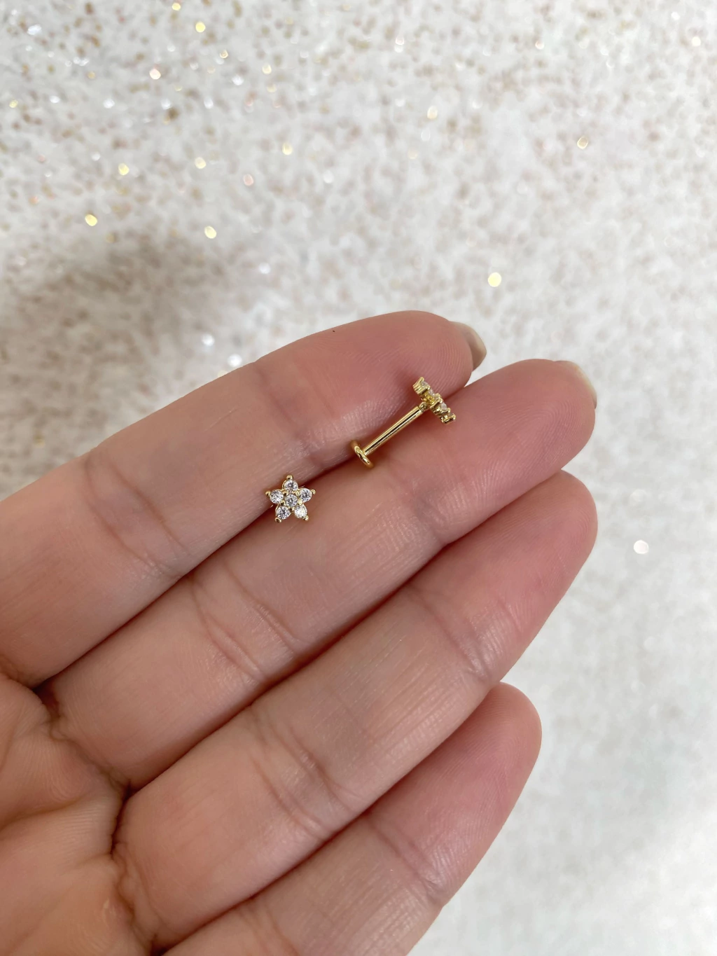 Piercing Reto Flor 5 Pontas Labret banhado a ouro é aquele toque feminino que se encaixa com tudo. Com design minimalista e super delicado, sua florzinha com cinco pétalas traz um brilho sutil, ideal para quem ama acessórios discretos mas cheios de estilo.