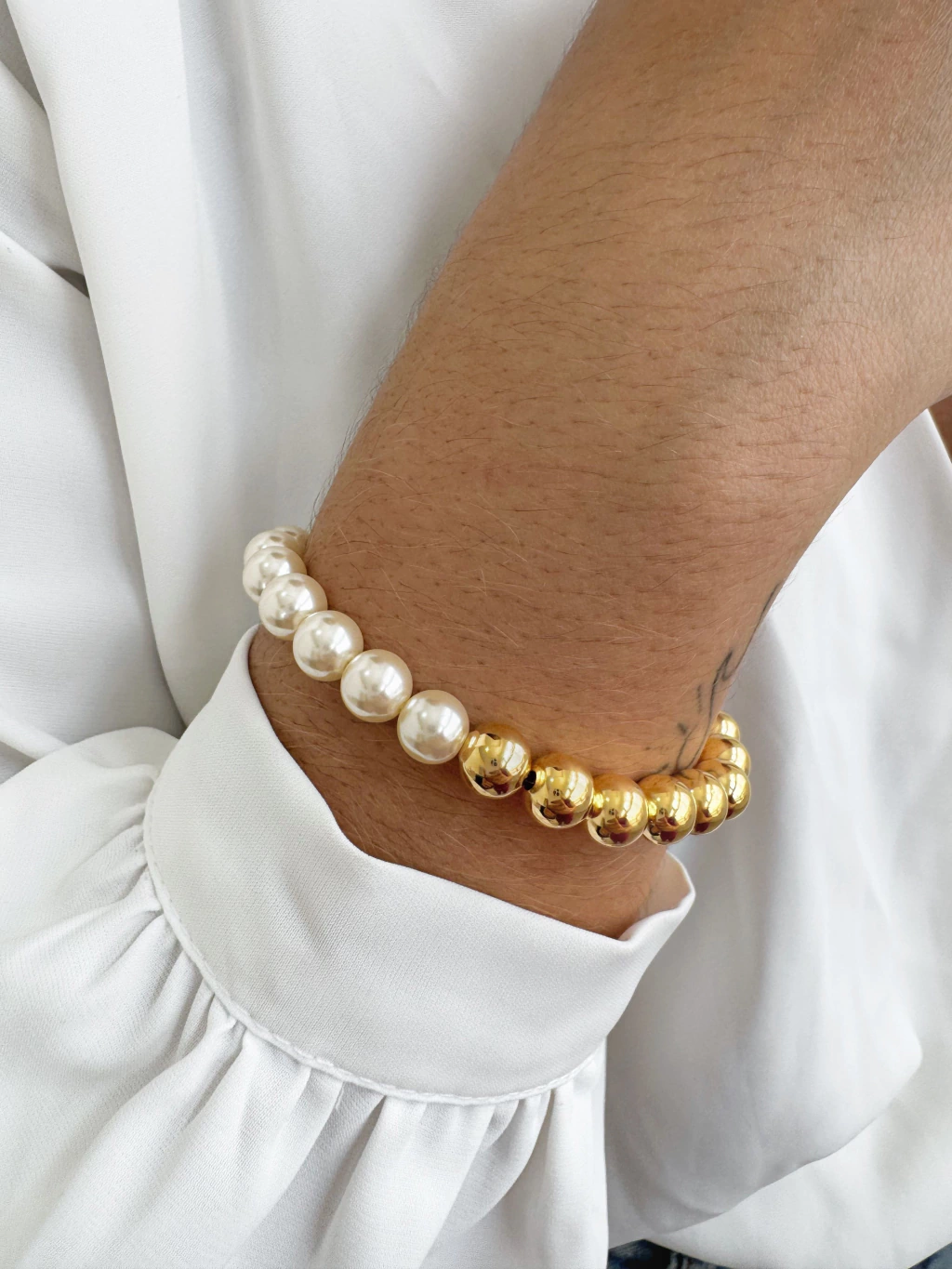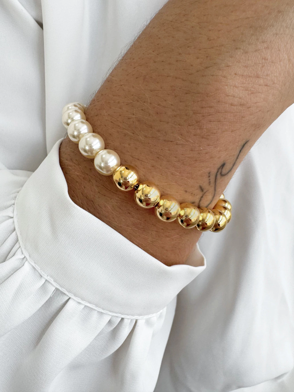 Pulseira Dualidade Pérolas e Esferas Média Banhada a Ouro