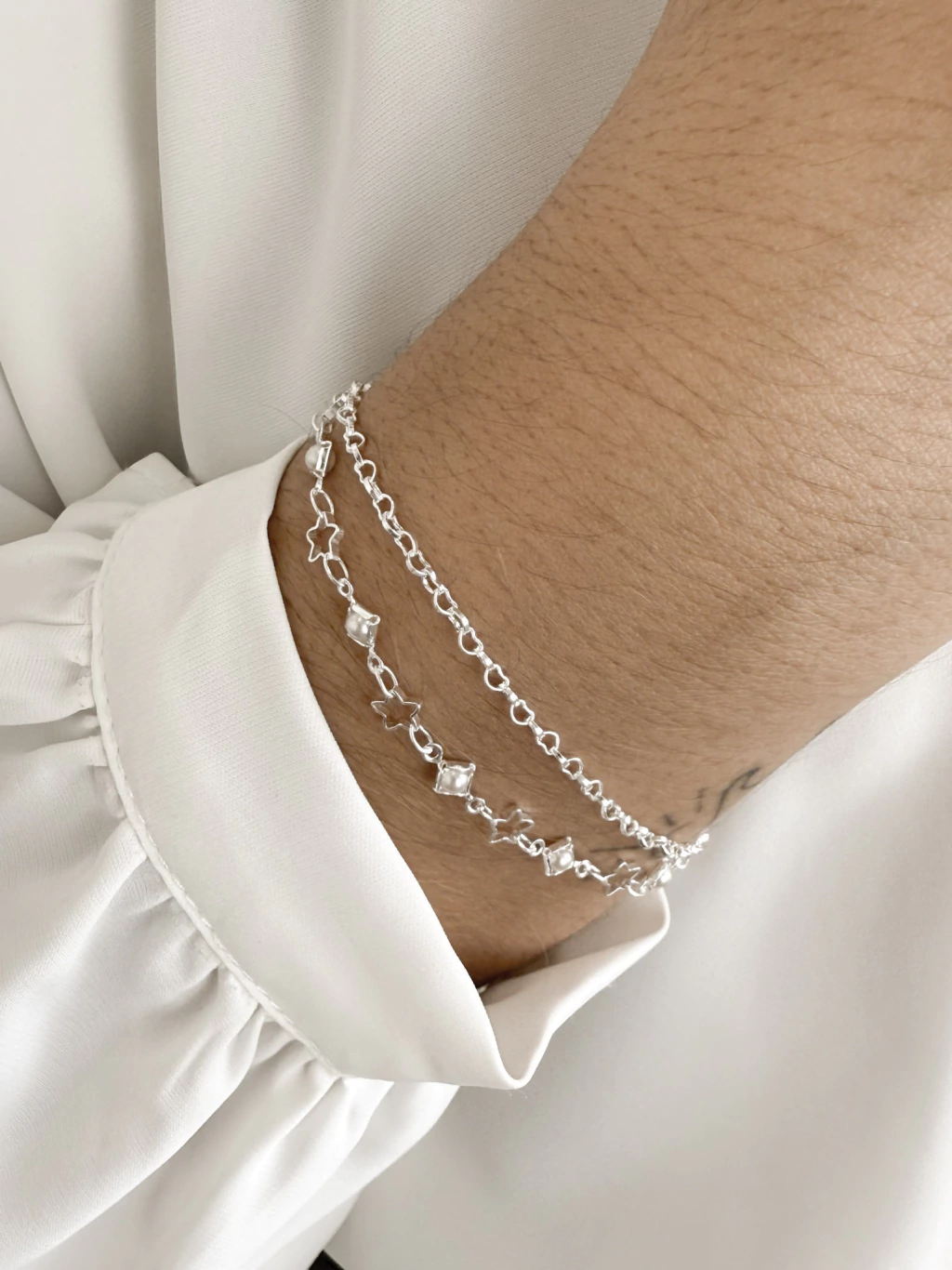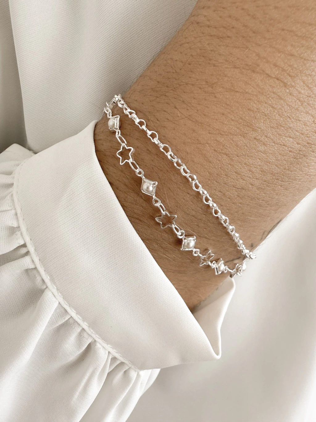 Pulseira Dupla Pérolas com Estrelas e Elos Corações Banhada a Prata