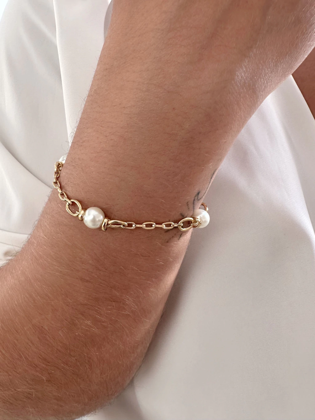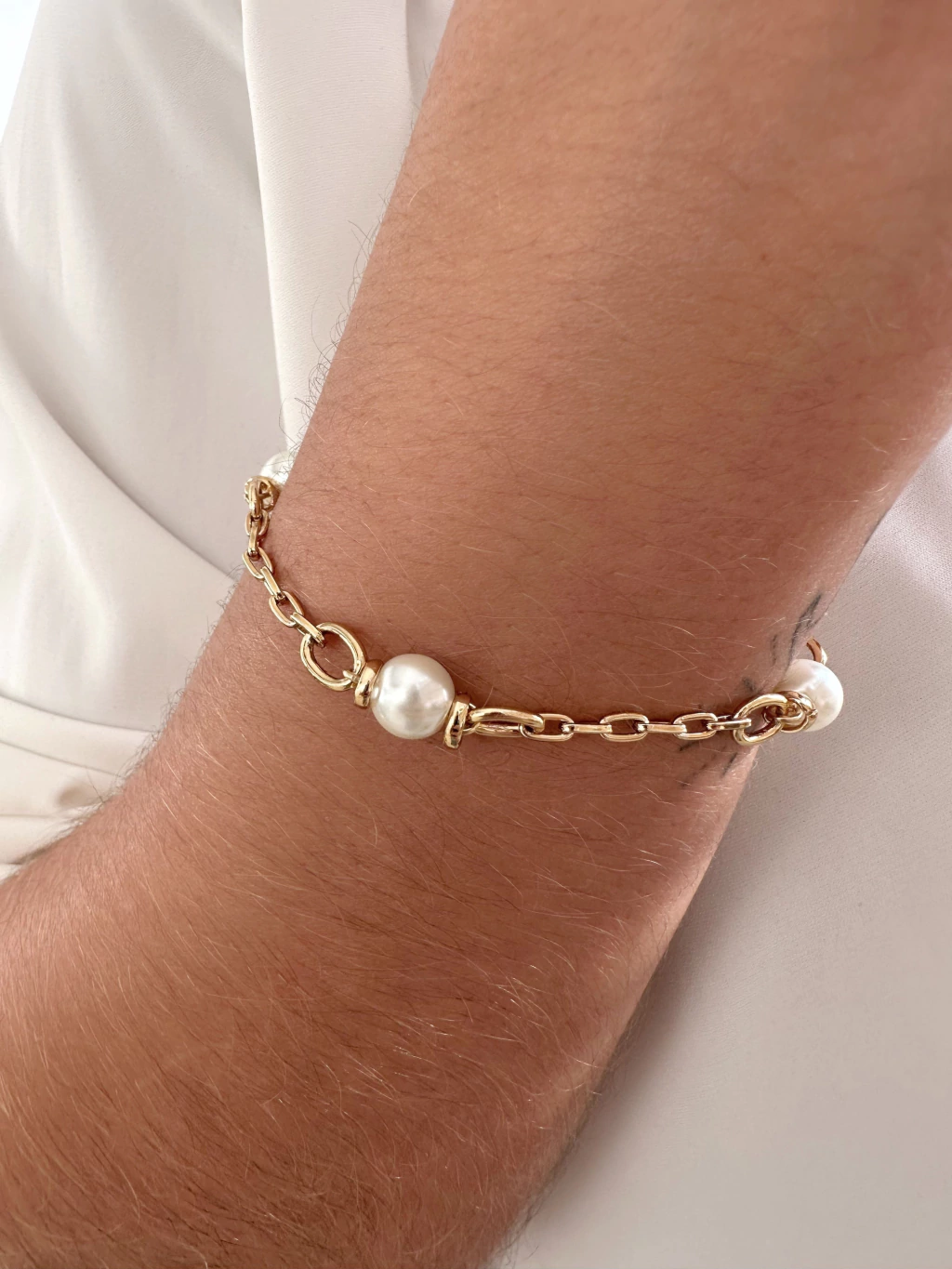 Uma pulseira delicada e charmosa que une a sofisticação das pérolas com a leveza dos elos dourados. As três pérolas centrais trazem um toque clássico, enquanto os elos adicionam modernidade, criando um equilíbrio perfeito para compor looks elegantes no dia a dia ou em ocasiões especiais.