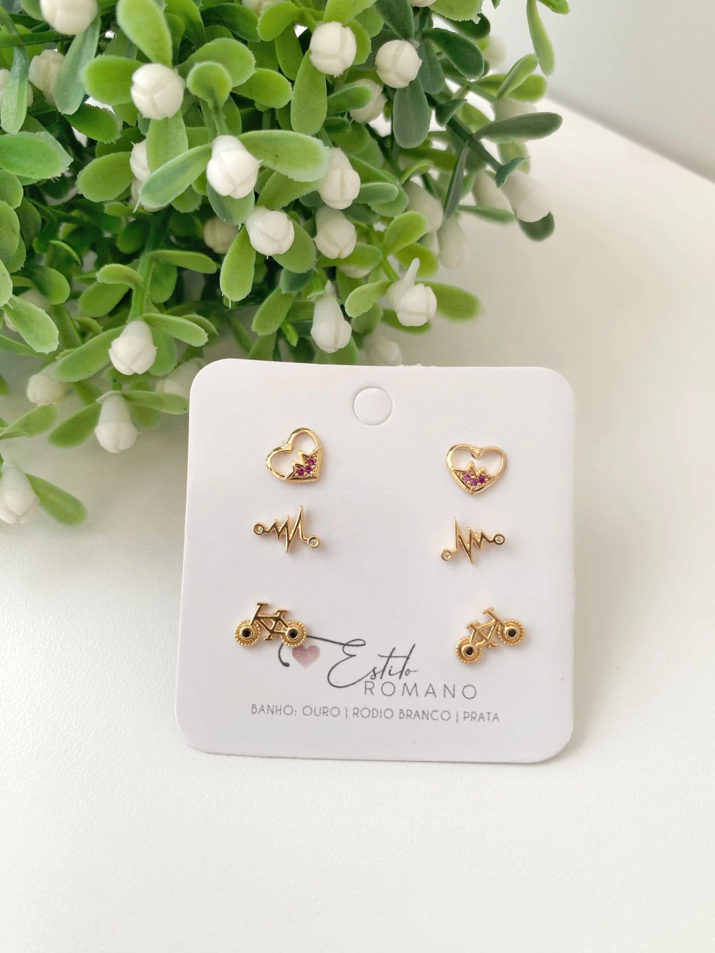 Esse trio de brincos é perfeito para quem ama pedalar e se expressar com estilo. Cada brinco traz detalhes delicados que remetem ao mundo do ciclismo, com um acabamento impecável em ouro que dá um toque de sofisticação. Uma peça leve e versátil, ideal para o dia a dia ou ocasiões especiais.